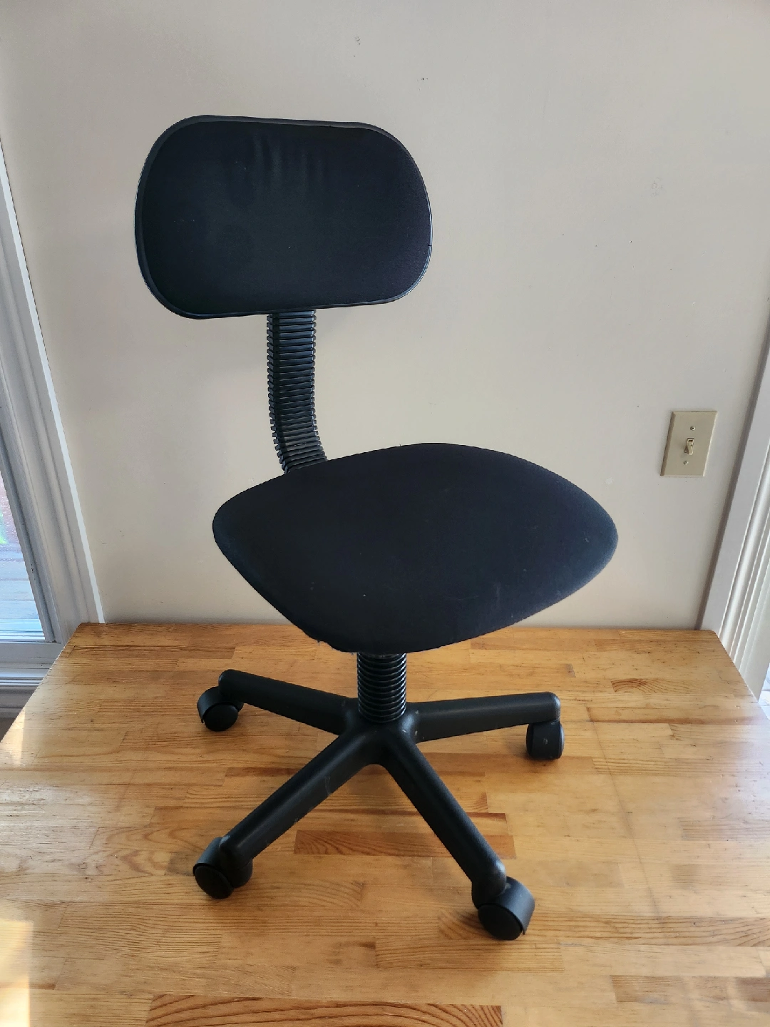 Free black office chair. It's in good condition and ready for a new home office setup! It features a comfortable seat and back, and it rolls smoothly.