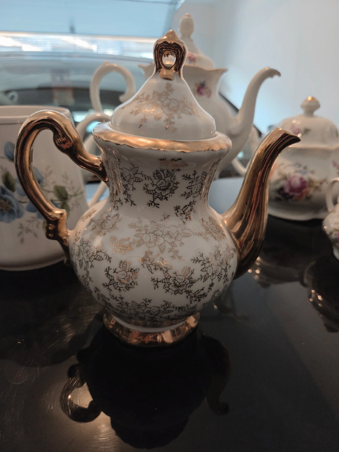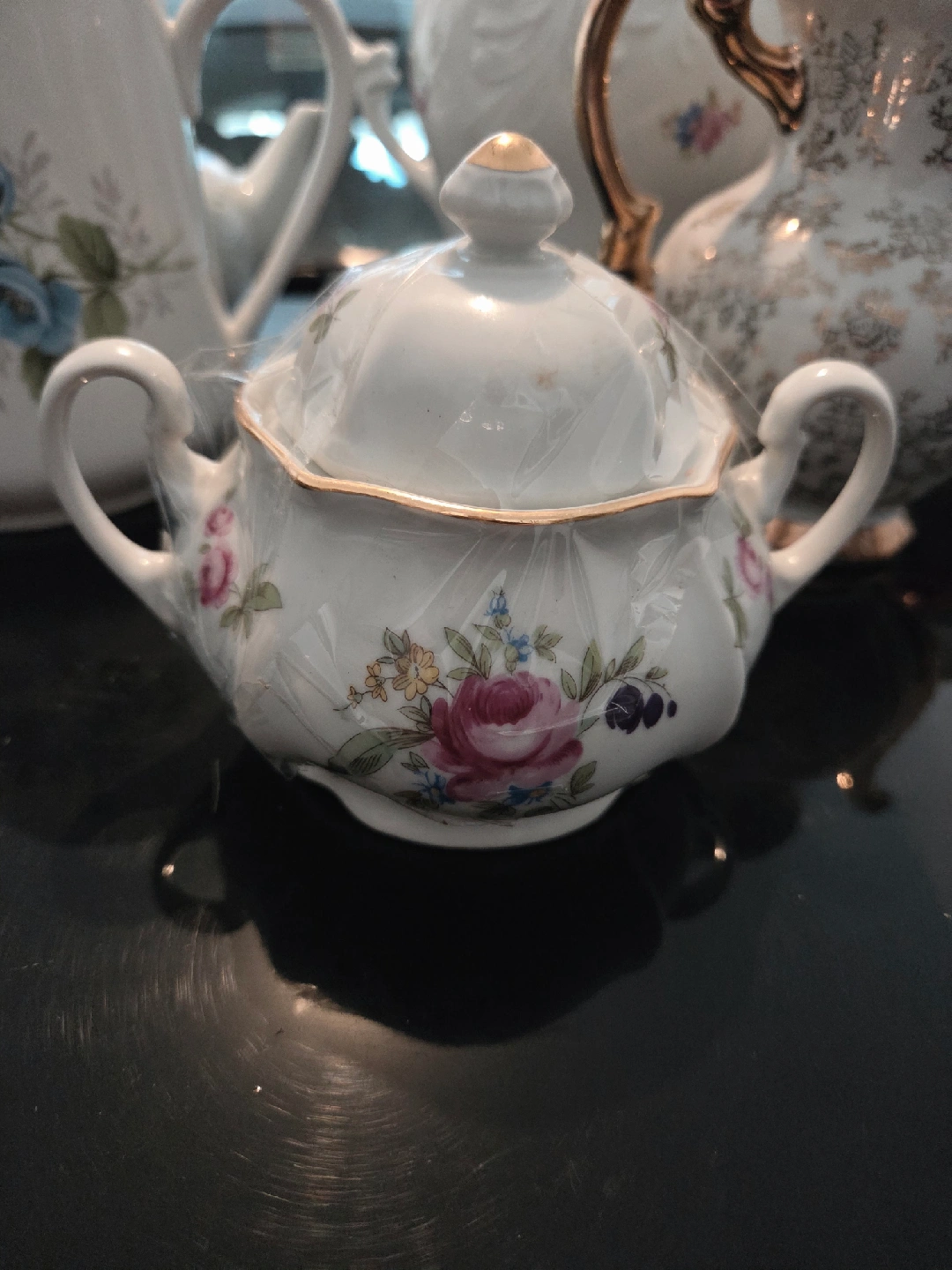 Selling a lovely vintage sugar bowl with a lid. It features a beautiful floral design with roses and other flowers. Perfect for adding a touch of elegance to your tea set or kitchen. It's in great condition and ready for a new home!
