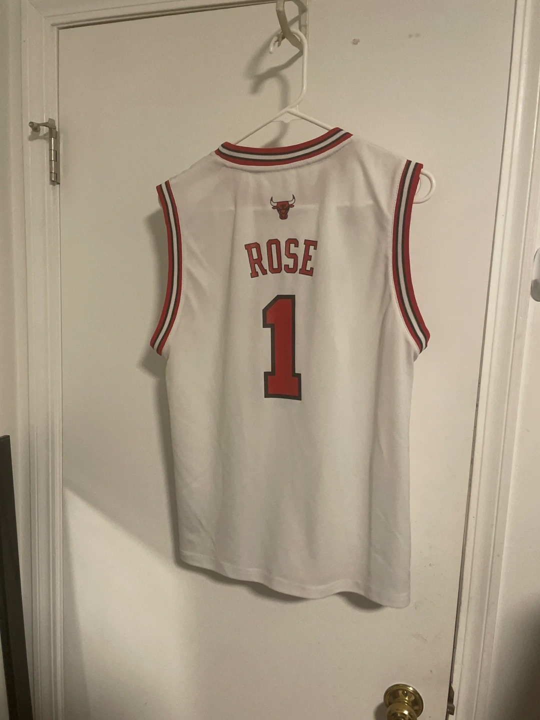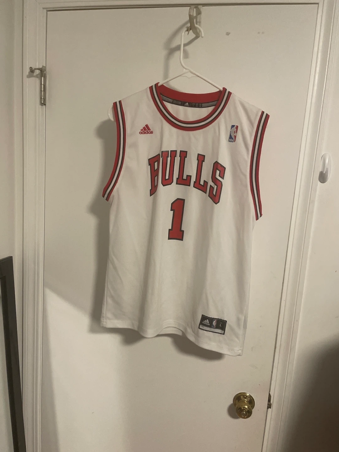 Selling an Adidas Derrick Rose #1 Chicago Bulls jersey in size Large. It's white with red and black accents. Great for any Bulls fan!