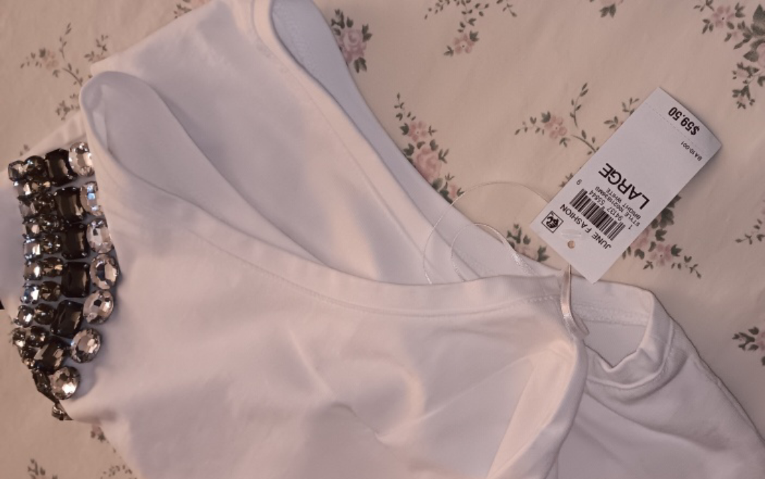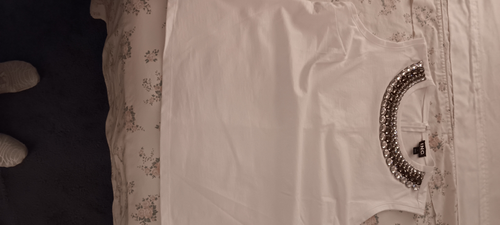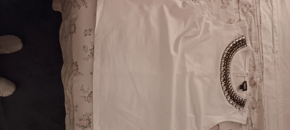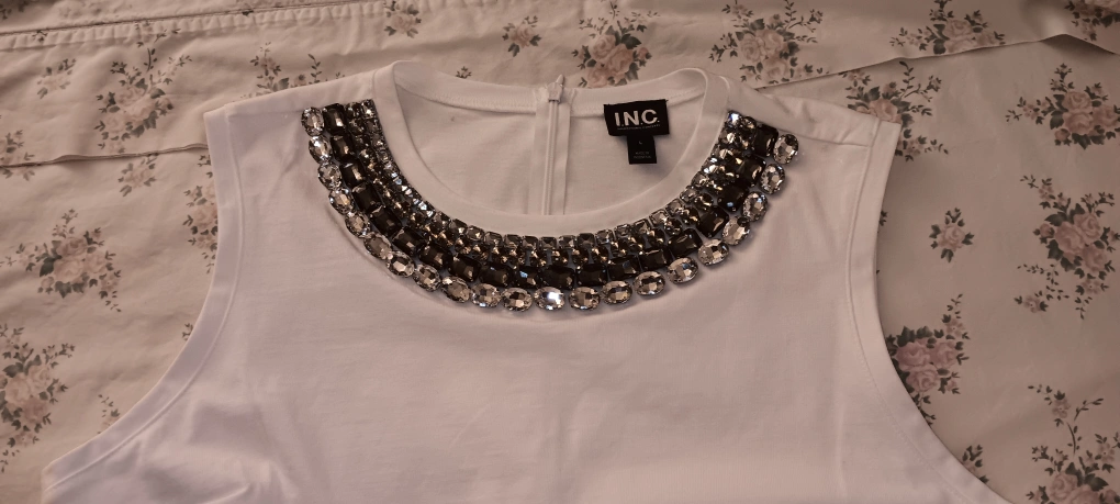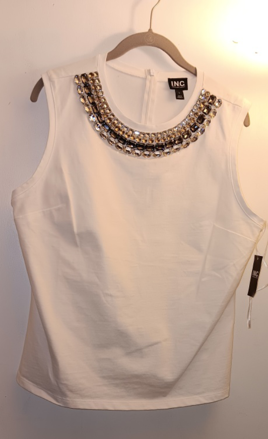 Selling a lovely white sleeveless top from INC! It's a size large and features a beautiful embellished neckline. The material is 100% cotton tee, making it super comfortable with back zipper. Perfect for dressing up or down!