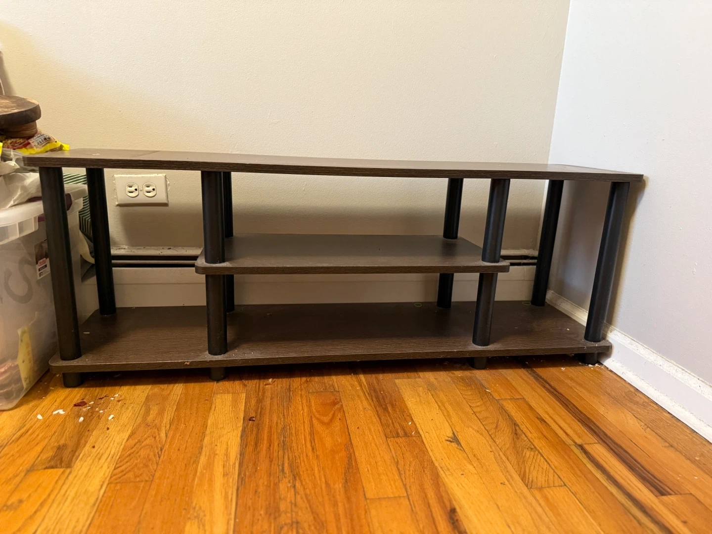 Selling a brown TV stand with three shelves. It's great for organizing your entertainment center or displaying decorative items. It has a simple design that fits well in any room