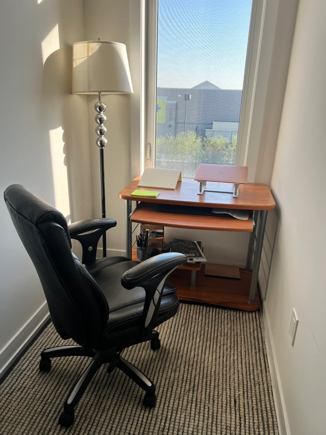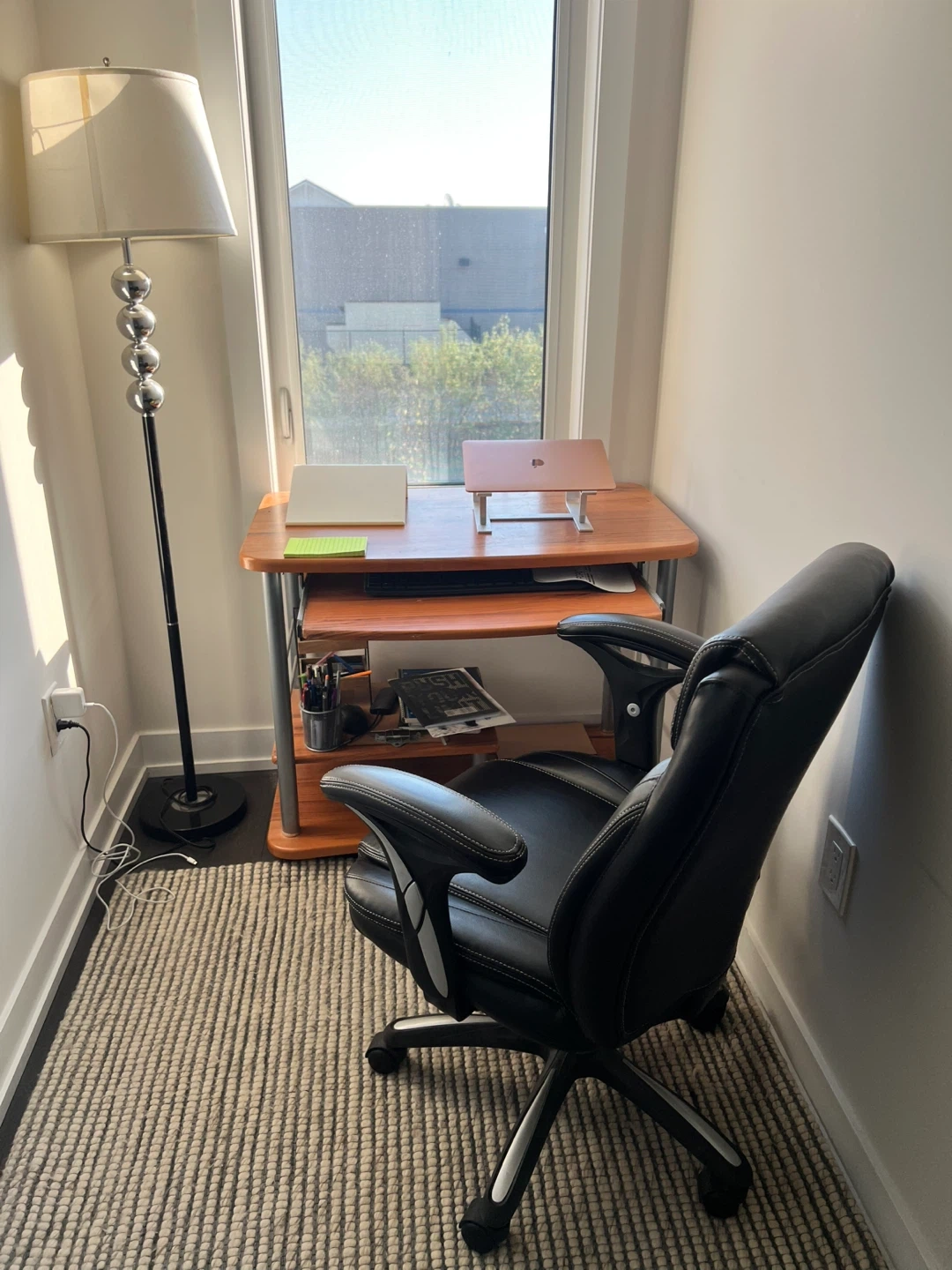 106Selling a small office desk and a comfortable black leather office chair. The desk is perfect for small spaces, and the chair is great for long hours of work. Both are in good condition and ready for pickup in Maple, Vaughan.
