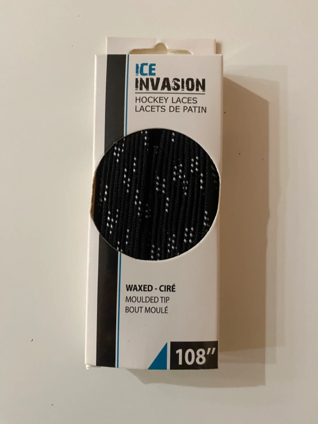 Brand new Ice Invasion hockey laces! These are waxed and have a moulded tip. They are 108 inches / 274 cm long, perfect for adult sizes 8-10