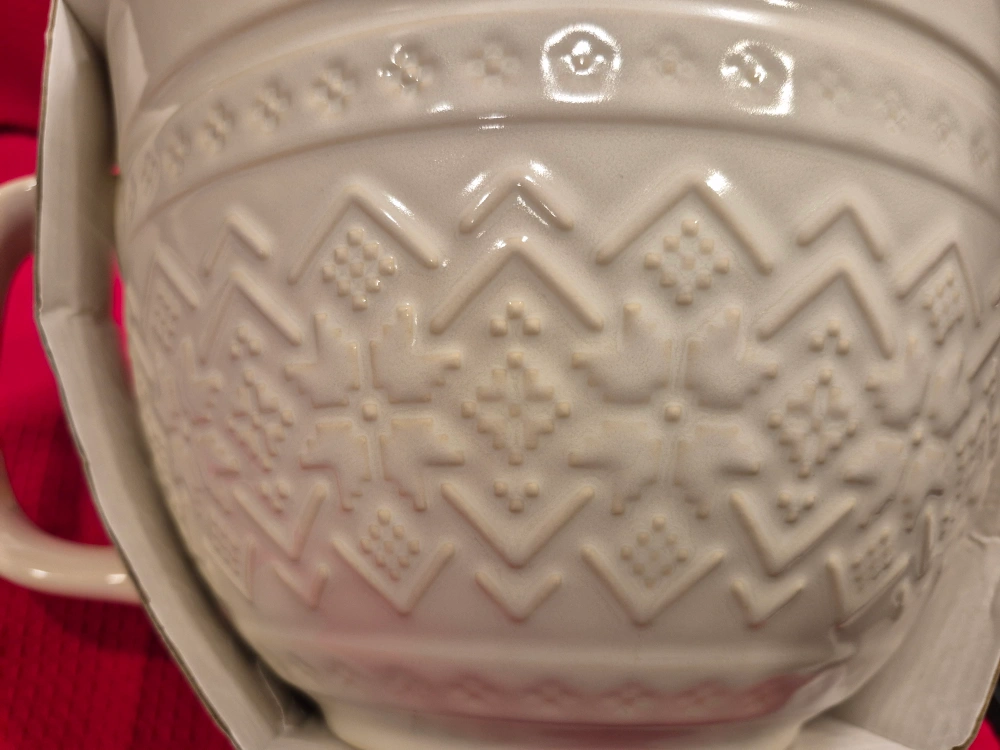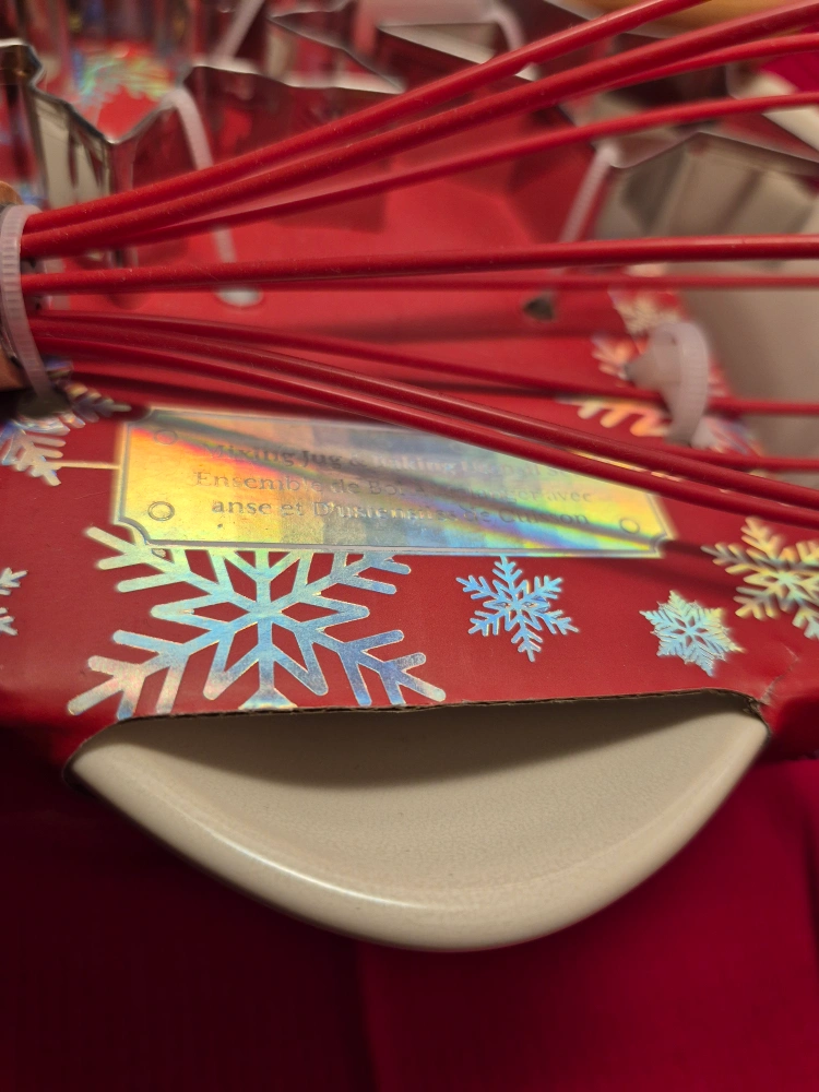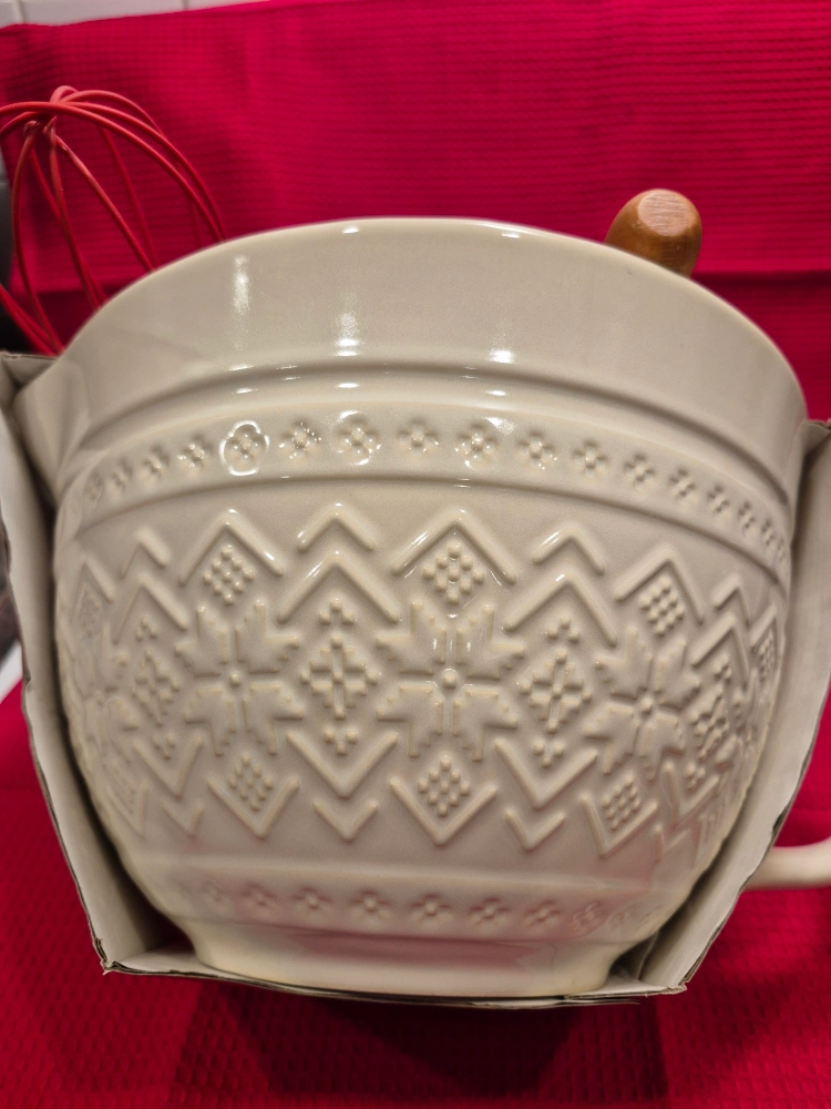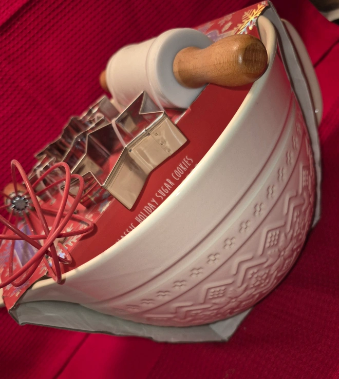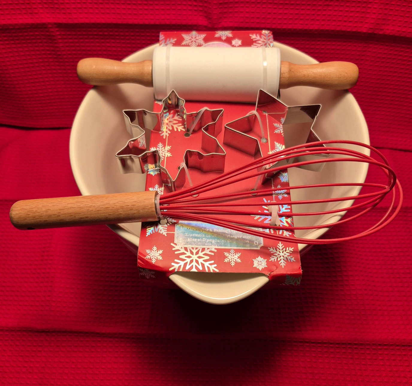 Get ready for the holidays with The Bakeshop Christmas Mixing Bowl and Baking Utensil Gift Set. It includes a ceramic mixing bowl with decorative snowflake pattern, snowflake cookie cutters, silicone whisk and tiny hands rolling pin along with a classic holiday sugar cookie recipe to get you started! Perfect for family holiday baking time! Brand new. Thanks!