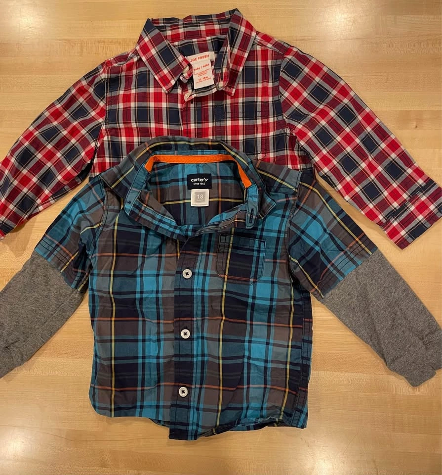 Adorable Baby Dress Clothes- each $5 Pic 1: Orange vest- 12 months Doggie vest- 18 months Blue checkered collared dress shirt- 9-12 months Argyle sweater- tag cut off but looks around 12-18 months Pic 2: Red checkered dress shirt- 12-18 months Blue checkered shirt- 18 months Pick up- Islington and Queensway