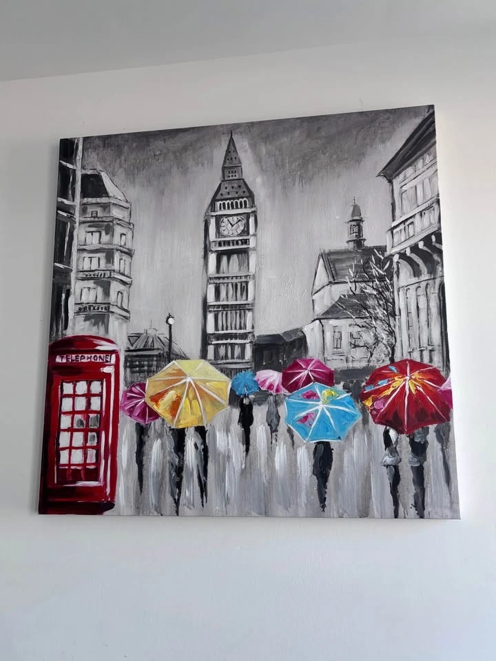 W/ H 100 cm. Lovely painting was purchased new less than a year ago. It adds a nice touch to your place, and it has oil paint touches as well which gives more value.