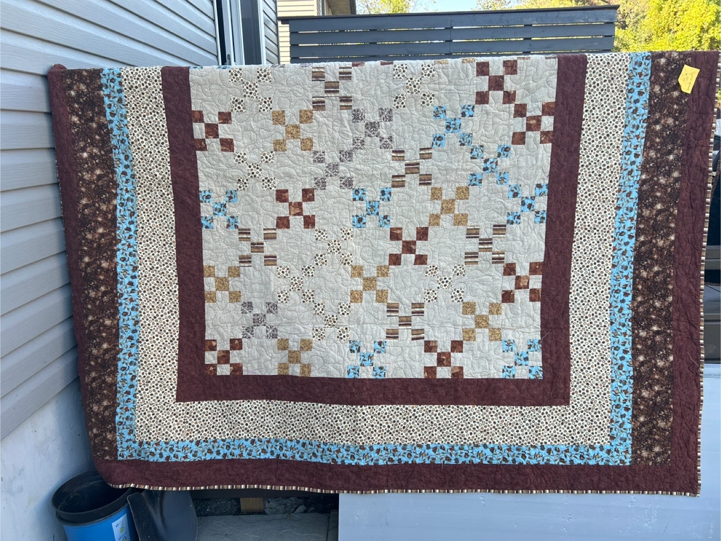 Selling a beautiful handmade quilted blanket. It features a variety of patterns and colours, perfect for adding a cozy touch to any room. It's in great condition and ready for a new home!