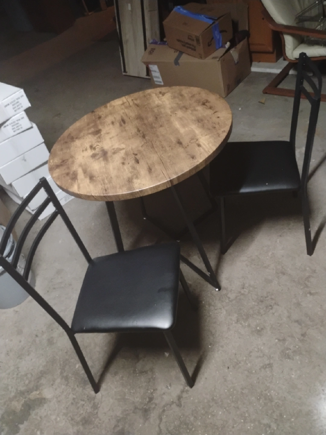 Selling a round dining table with two chairs! The table has a wood-look top, and the chairs have black seats with metal frames. It's a great set for a small space or apartment