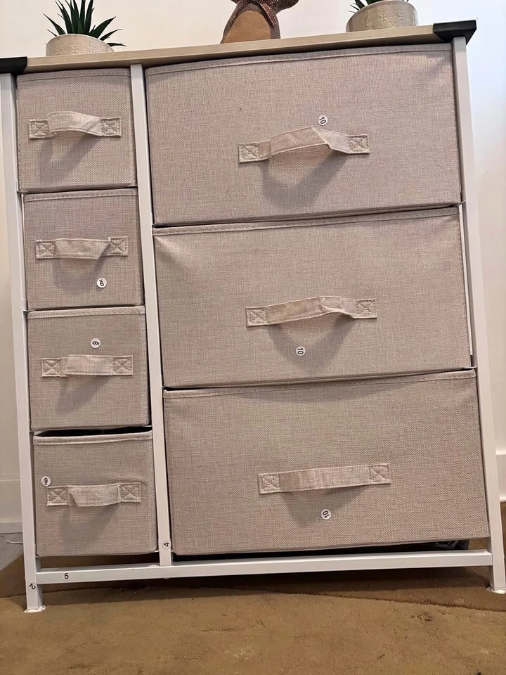 In perfect condition...it is lovely. Colors add a nice touch to your place. Used to store books. Textile drawers