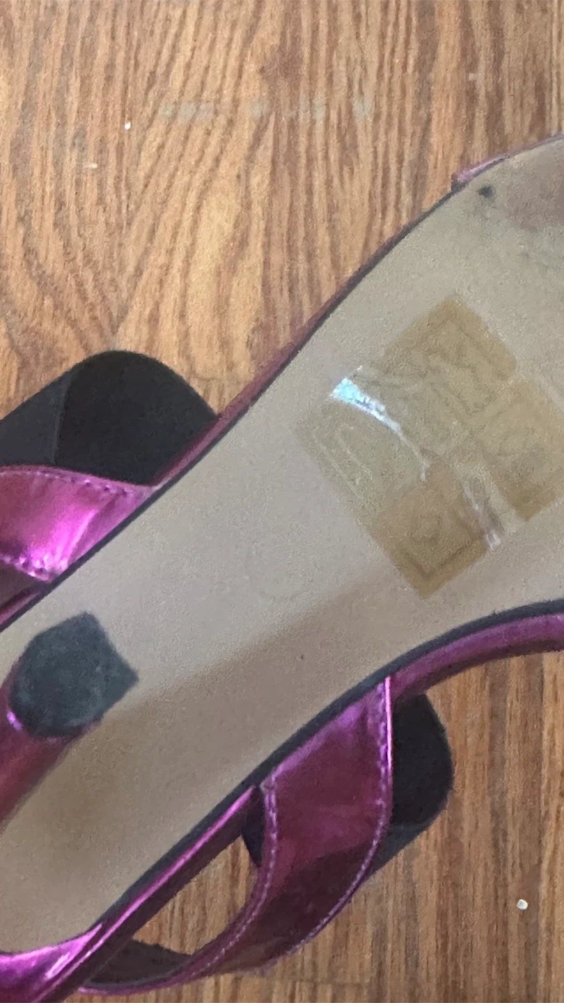 113These heels are a vibrant pink colour and size 37. They feature a stylish black elastic strap for comfort and a sleek heel. Perfect for adding a pop of colour to any outfit!
