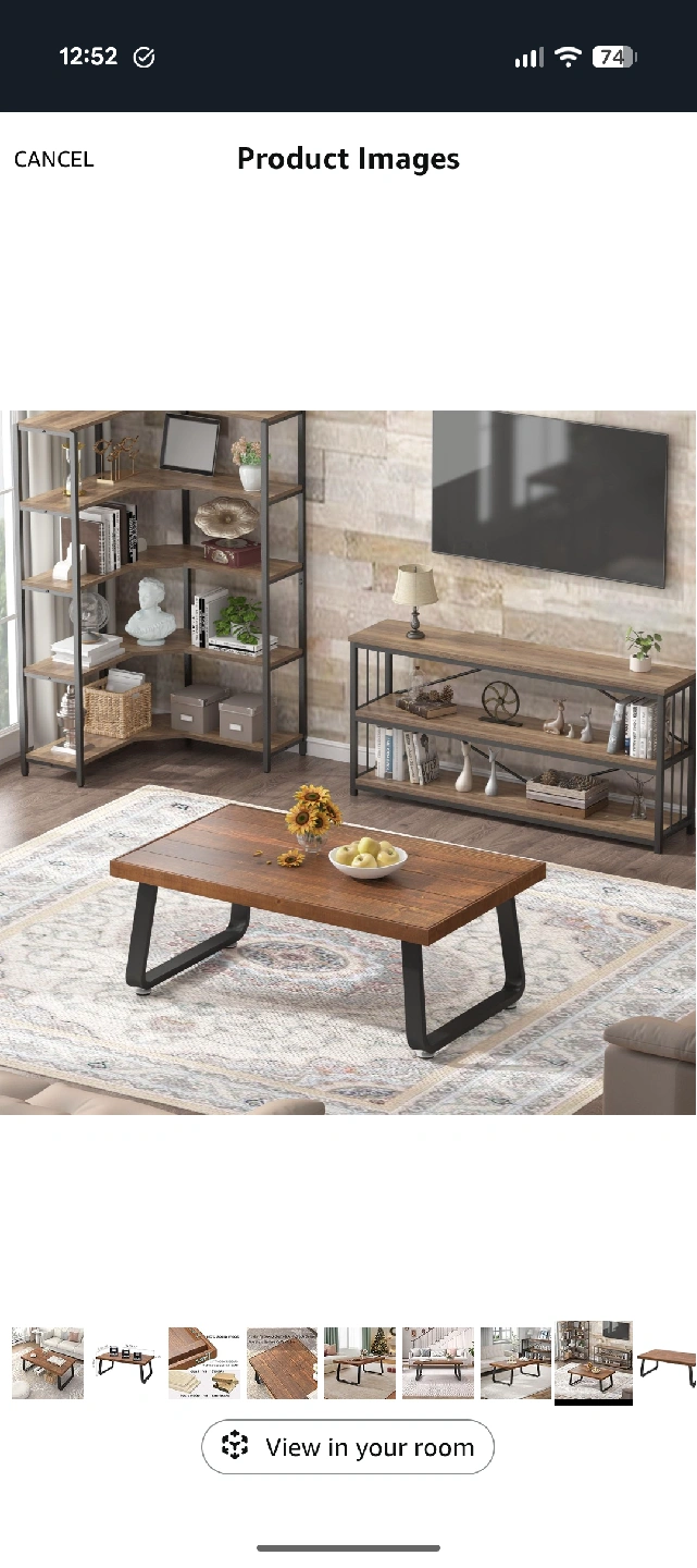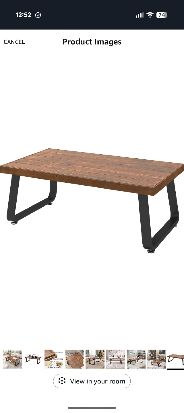 This coffee table features a rustic fir wood grain and an anti-crack design. It's made of 100% solid wood, with a 1.97" thickness board and a 1.38" thickness edge frame. The dimensions are approximately W:39.37" x D:21.65" x H:18.4".