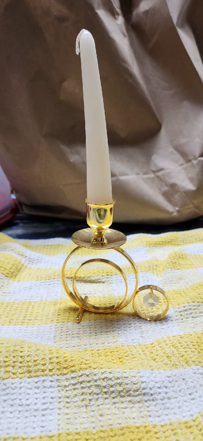 Selling a unique gold-coloured metal candle holder. It features a circular design with a separate ring accent. Perfect for adding a touch of modern elegance to your home decor