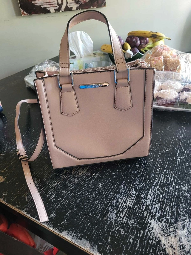 This stylish Steve Madden bag is perfect for adding a touch of elegance to any outfit. The bag features a chic design with a structured silhouette and sturdy top handles, making it both fashionable and practical. The exterior is a soft blush tone, which complements the silver-tone hardware, and the interior is lined with a durable fabric. I'm asking $25 for this purse, which is a great deal! If the ad is up, the item is available!