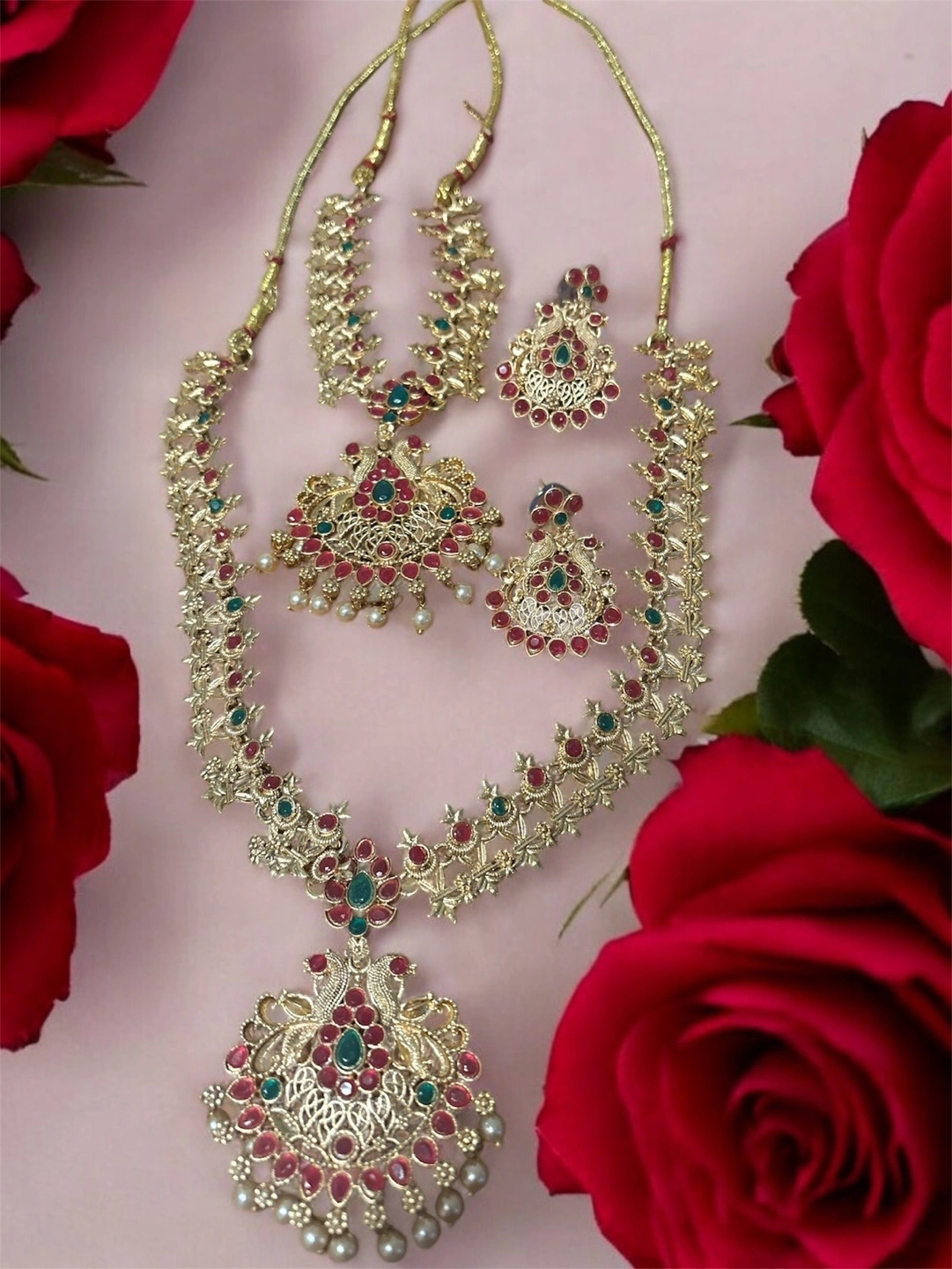 Stunning necklace set. Features red and green stones. Includes matching earrings. Beautiful gold-tone finish. Perfect for special occasions.