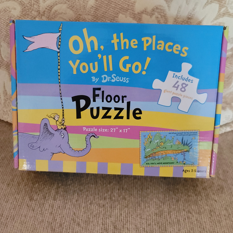 Looking to entertain your little one? This Dr. Seuss floor puzzle is perfect for kids. It's the 'Oh, the Places You'll Go!' puzzle, and it includes 48 giant pieces. The assembled puzzle is 27" x 17".
