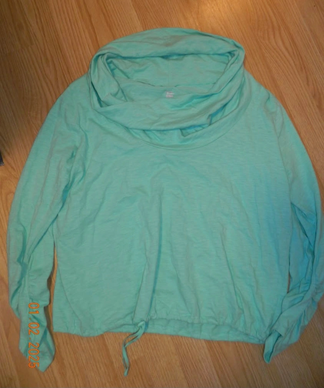 Selling a cute Old Navy cowl neck top in a refreshing mint green colour. It's a size small and features a drawstring at the bottom. Perfect for a casual and comfy look!