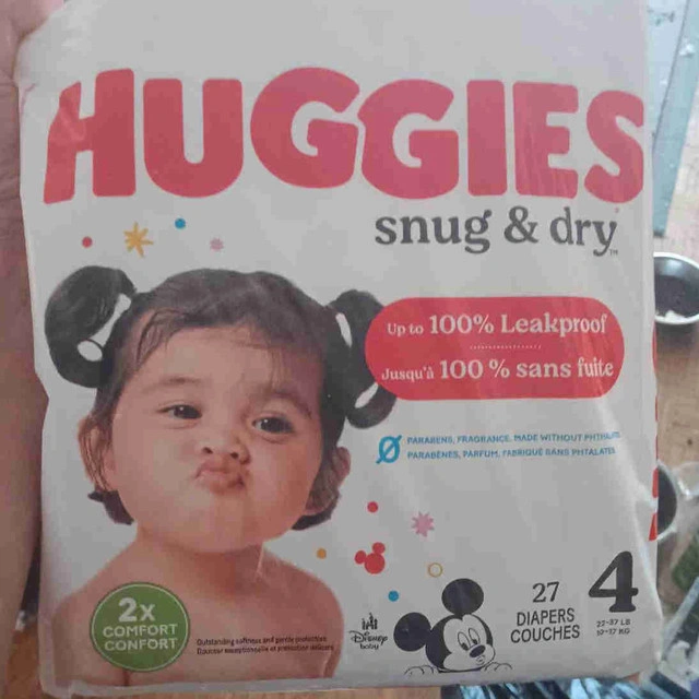 I have two packages of Huggies Snug & Dry size 4 diapers, each containing 27 diapers, for a total of 54 diapers. These diapers offer up to 100% leakproof protection and are designed for babies weighing 22-37 lbs (10-17 kg). They are new and unopened, ensuring top quality and hygiene for your little one. * Size: 4 * Count: 27 per pack (2 packs available) * Weight Suitability: 22-37 lbs (10-17 kg) * Features: Up to 100% leakproof protection Based on Kijiji and Facebook Marketplace listings, similar packs typically sell for $15-$25, so I've priced these competitively for a quick sale. If the ad is up, the diapers are available. $20 each. 647-203-0411