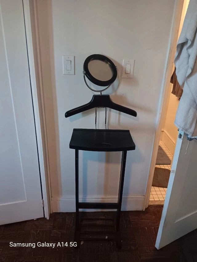 This Kings Brand Millet wood suit valet stand is designed to keep your suit organized and wrinkle-free, featuring a contoured hanger, accessory tray, and sturdy base. This item is used and has some minor wear and tear. Keep your favorite suit ready to go with this handy valet stand! It's perfect for keeping your clothes organized, and it adds a touch of class to your room. If the ad is up, it's available! Im helping my friend sell his furniture. Richard (416) 500-5170