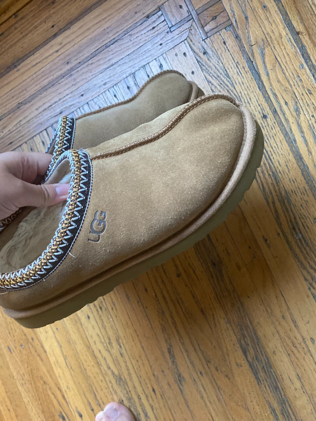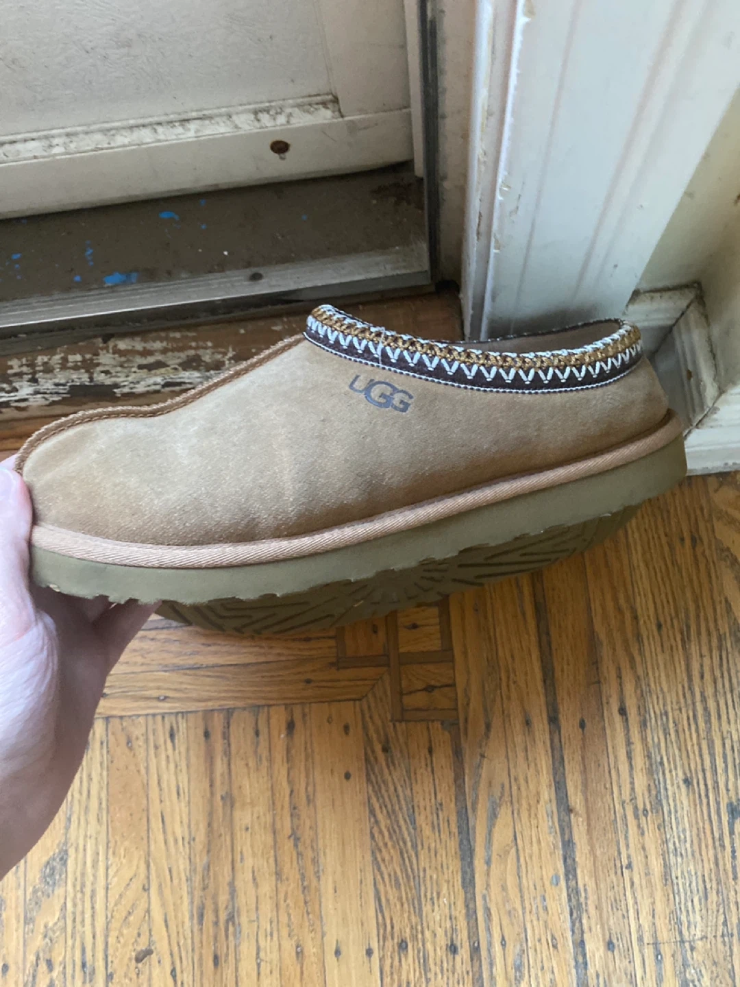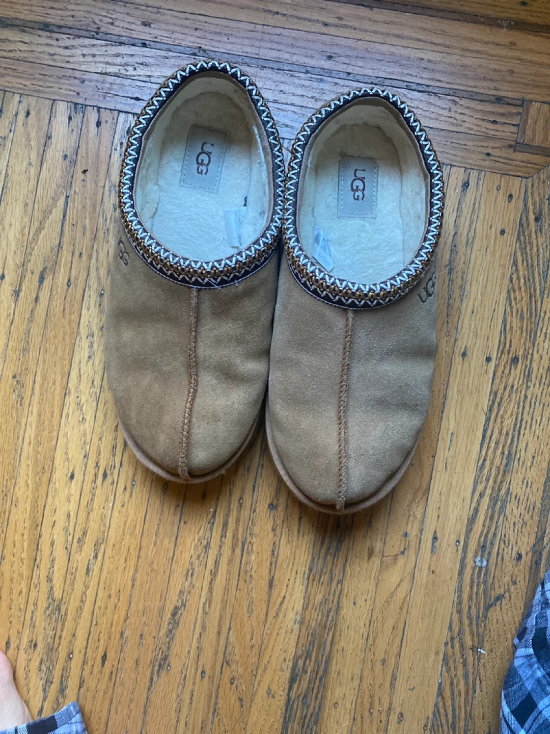 Cozy UGG Tasman slippers in great condition! These are a mens size 9 and are perfect for wearing around the house or running quick errands. They feature the classic UGG comfort and a stylish braided trim