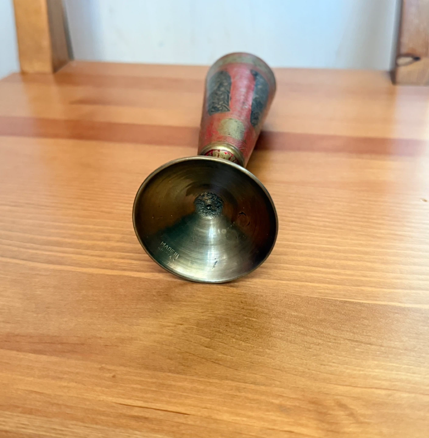 Selling a vintage etched brass goblet. It has a beautiful, intricate design with red, black, and gold detailing. Perfect for adding a touch of elegance to your home decor!
