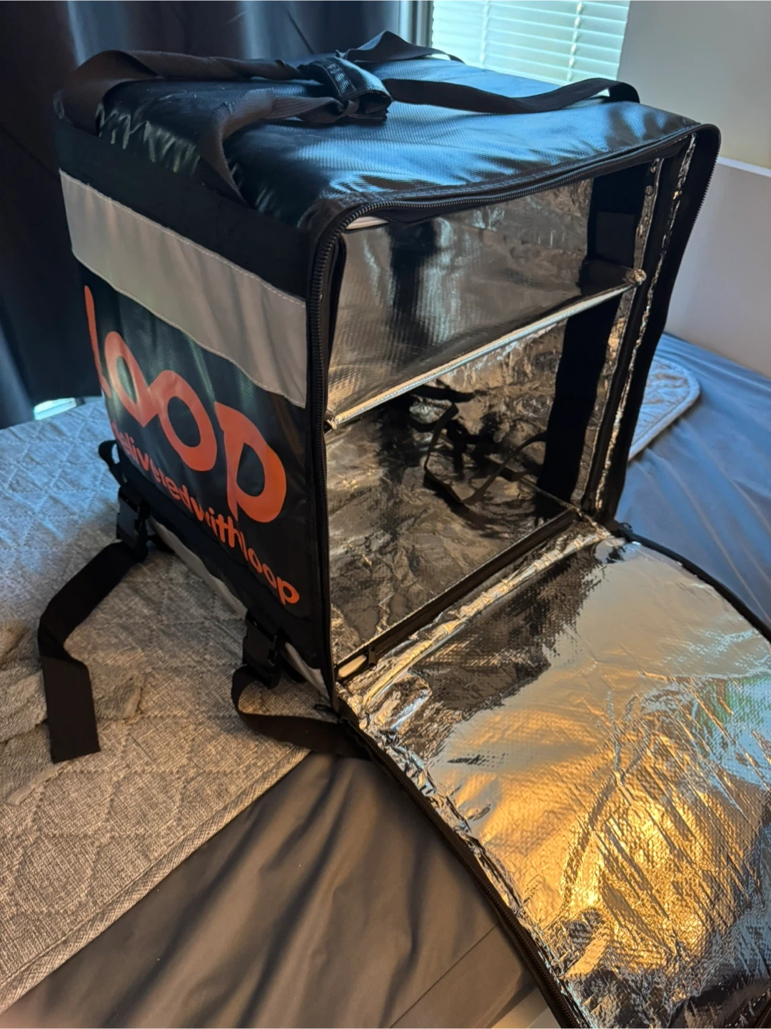Selling a Loop delivery backpack. It's in great shape and ready for your delivery needs! The interior is lined with a reflective material to help keep food at the right temperature. Perfect for scooter or bike deliveries!
