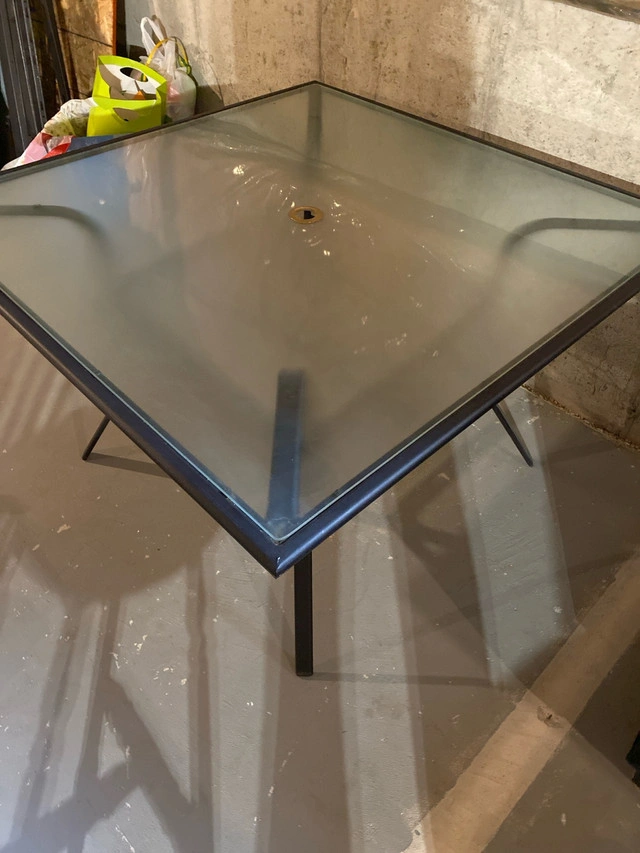 This square glass-top patio table, with dimensions of 45x45 inches, is perfect for any outdoor setting. It features a sleek, dark metal frame and a centre hole for an umbrella. It is in used condition, showing normal wear and tear. Specifications: * Shape: Square * Dimensions: 45 x 45 inches * Material: Glass top with metal frame * Umbrella hole: Yes Comparable tables are typically listed on Kijiji for around $75-$150. Given its condition, I've priced it at $40 If this ad is still up, the table is available. Don't miss the chance to add this beautiful piece to your patio!