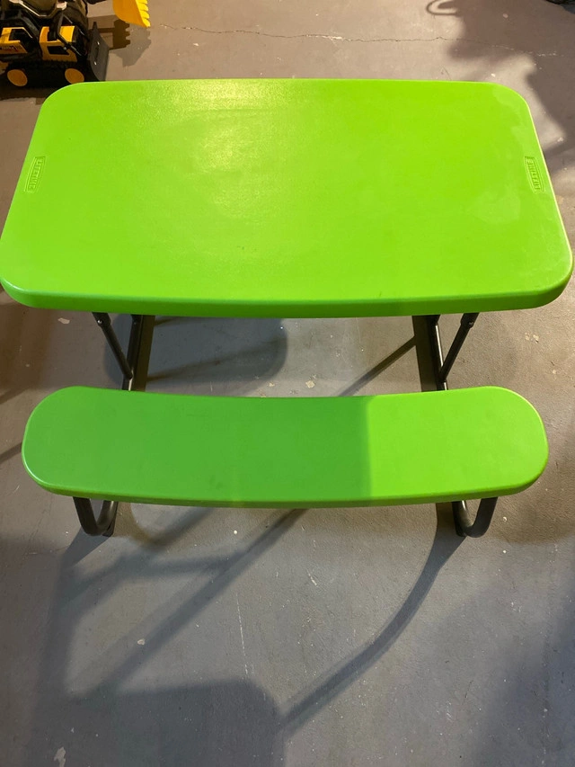This is a used Lifetime kids picnic table, perfect for outdoor fun and snacks. It's in good condition and ready for a new home! This vibrant green table can comfortably seat four children, making it ideal for playdates or family picnics in the backyard. * Brand: Lifetime * Colour: Green * Seats: 4 children * Foldable: Yes, for easy storage Looking to add a splash of colour to your backyard? This picnic table is ready to go! Don't miss out on the chance to create fun memories with your kids. If you're reading this, yes, it's still available!