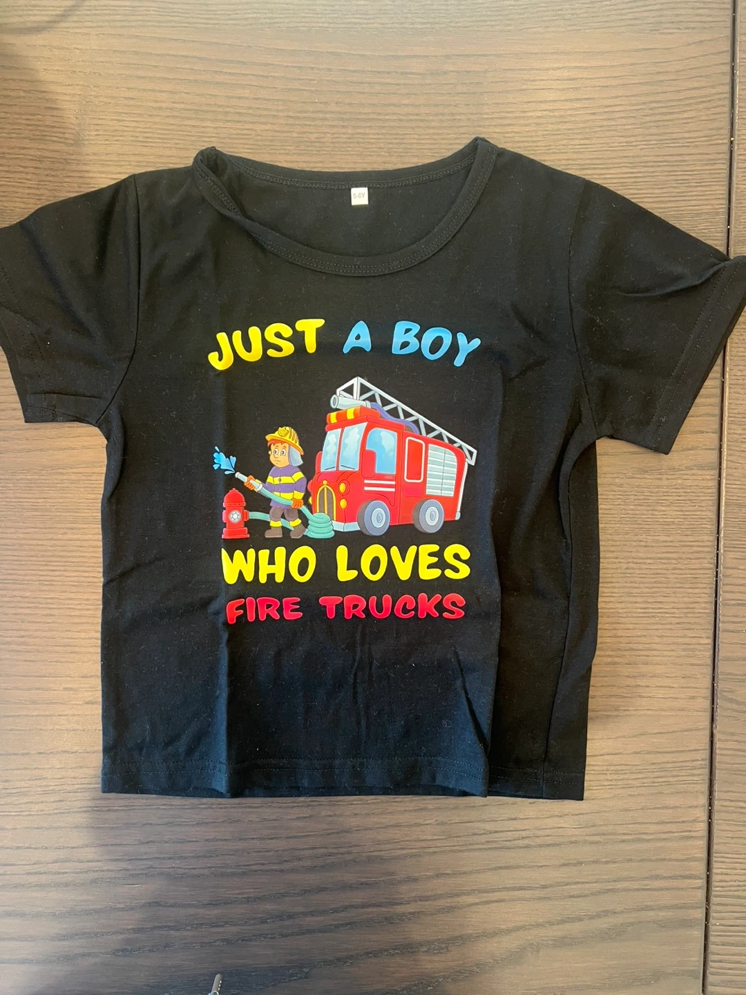 Cute black t-shirt for a boy, featuring a fun fire truck design! The shirt says "Just a boy who loves fire trucks", perfect for any little firefighter fan.