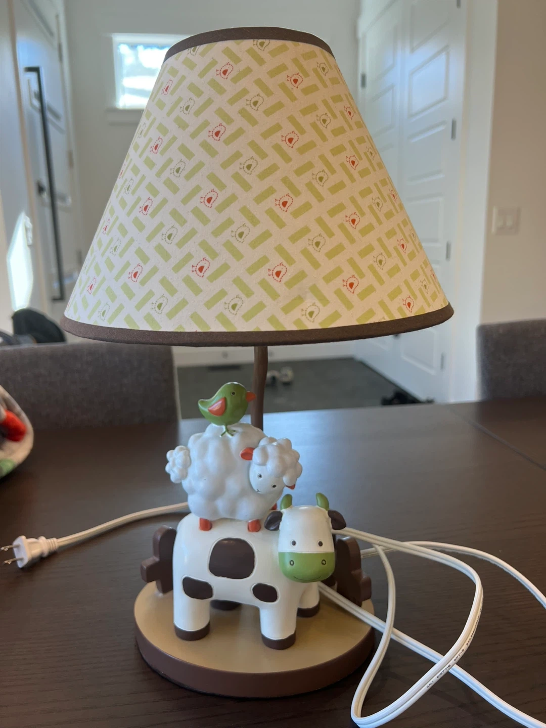 Super cute lamp for a kid's room! It features a cow, sheep, and bird design. The lampshade has a fun pattern too. It would look great in a nursery or playroom