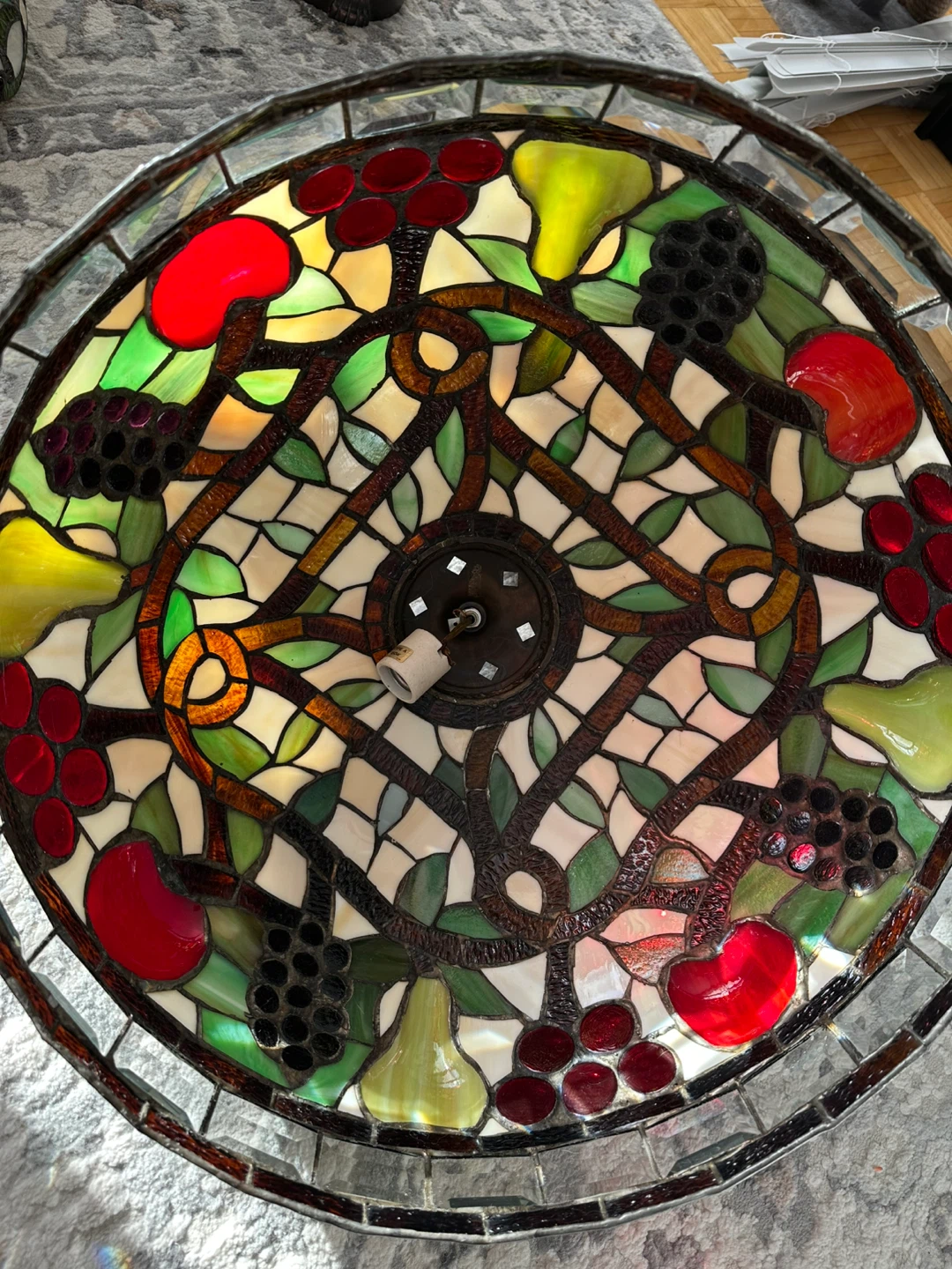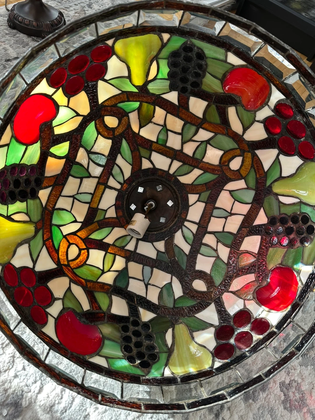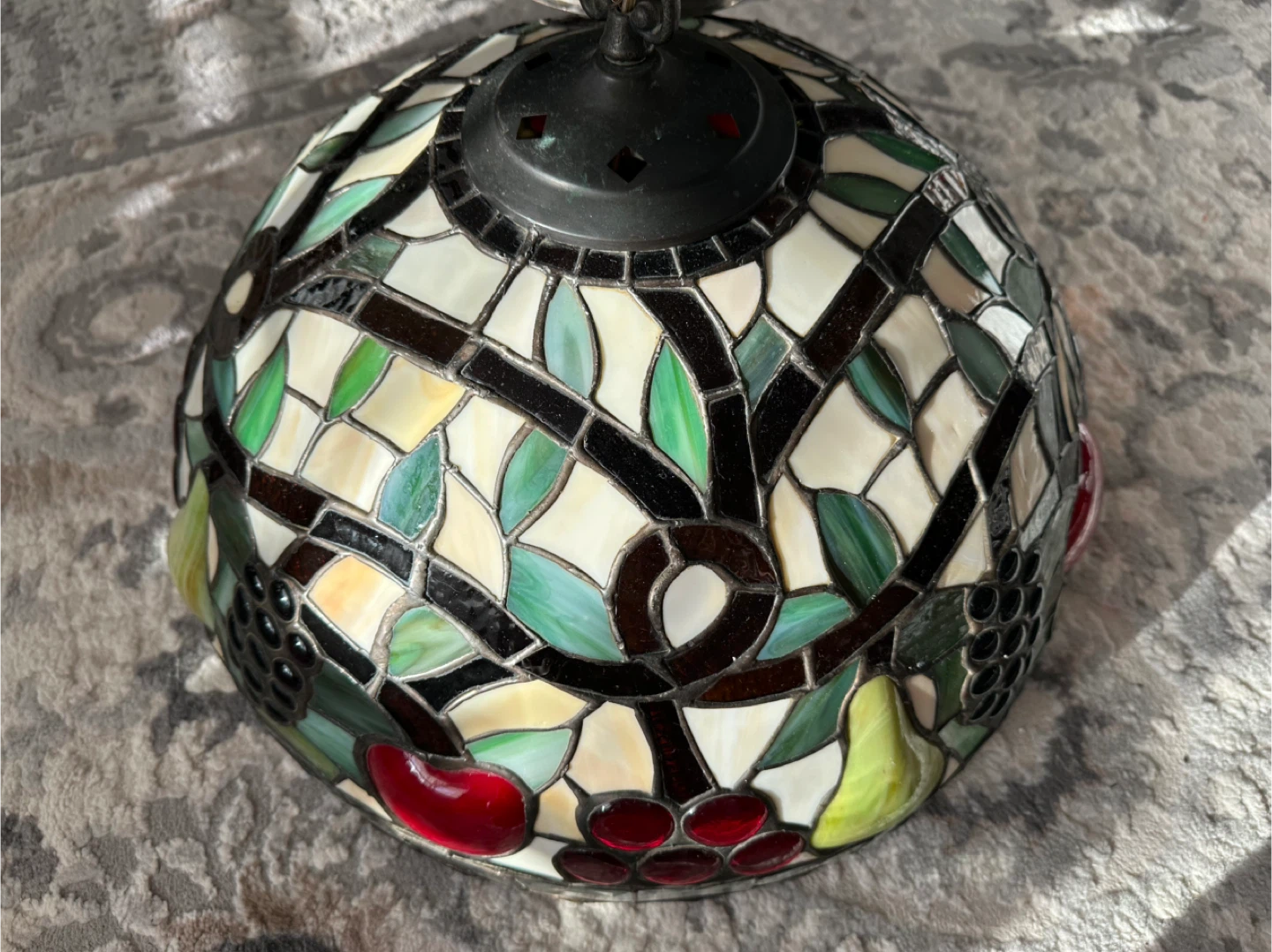 Beautiful stained glass chandelier with a fruit pattern. It features grapes, pears, and cherries in a mosaic design. This lamp would be a lovely addition to any room, especially kitchen or dining room