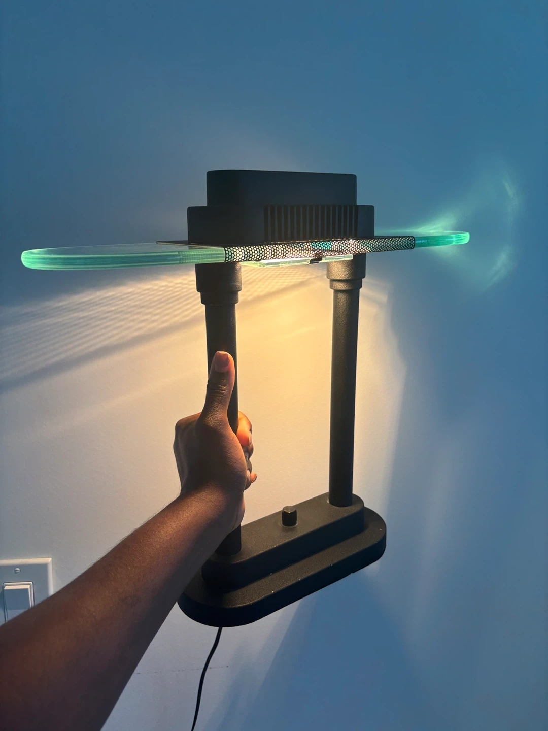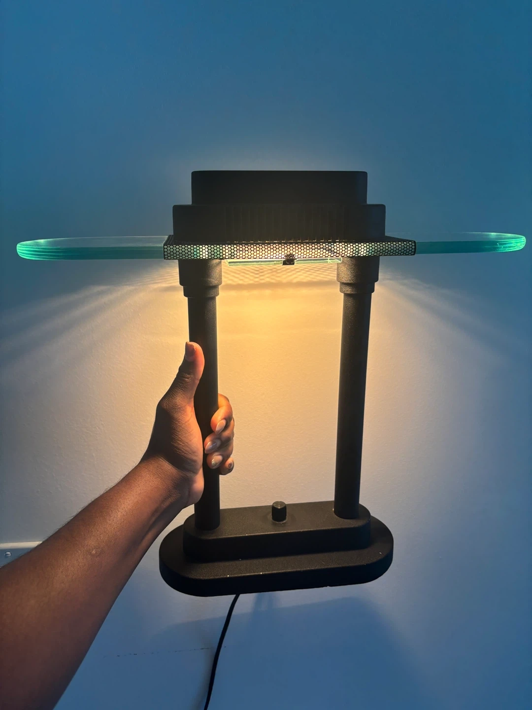 Selling a unique black desk lamp that features a glass shelf. It's in great condition and provides a nice ambient light, perfect for any workspace or bedside table!