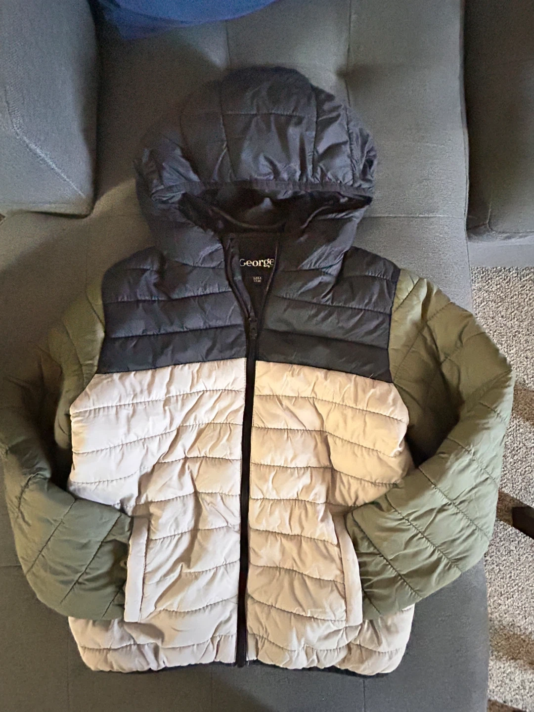 Rush!Rush!Rush! Selling a gently used George puffer jacket for boys. It's a size 12/14. The jacket features a stylish colour block design with black, beige, and olive green. Perfect for keeping your little one warm and cozy during the colder months! Free delivery around area!.
