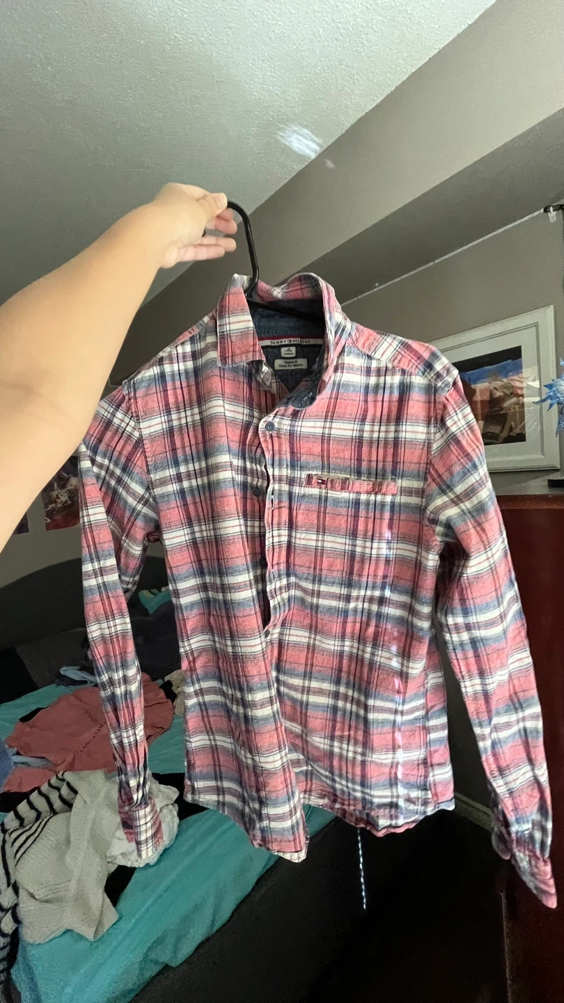 Here's a Tommy Hilfiger flannel shirt in great condition! It features a classic plaid pattern with a blend of pink, white, and navy blue. Perfect for layering or wearing on its own