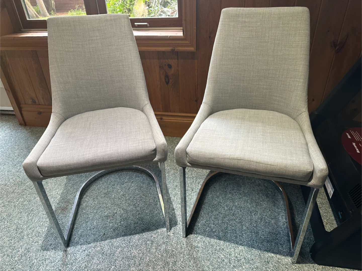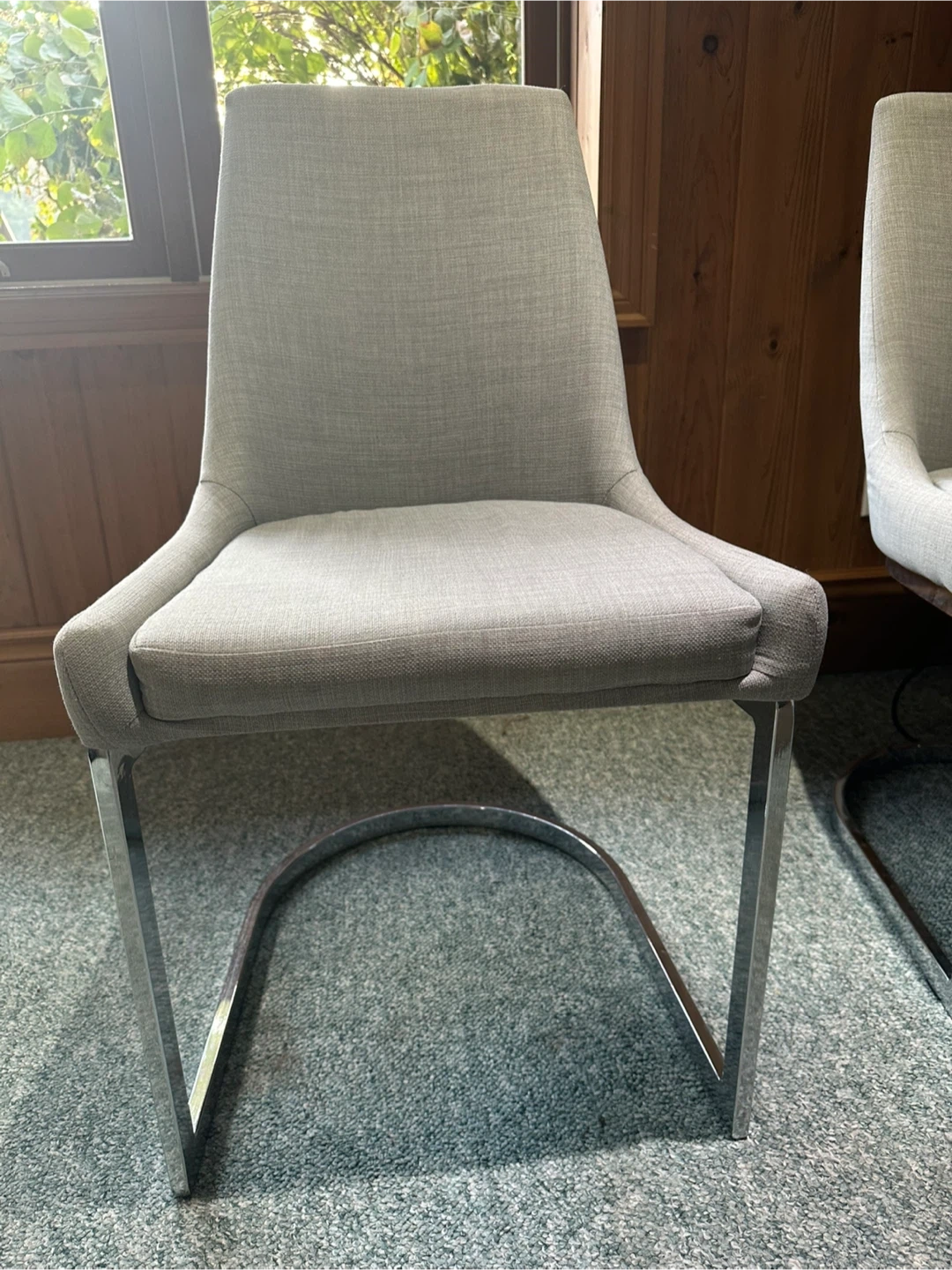 Selling a set of two dining chairs. They feature a light grey fabric and a unique chrome base. These chairs would be a great addition to any dining space! Brand new, not used.
