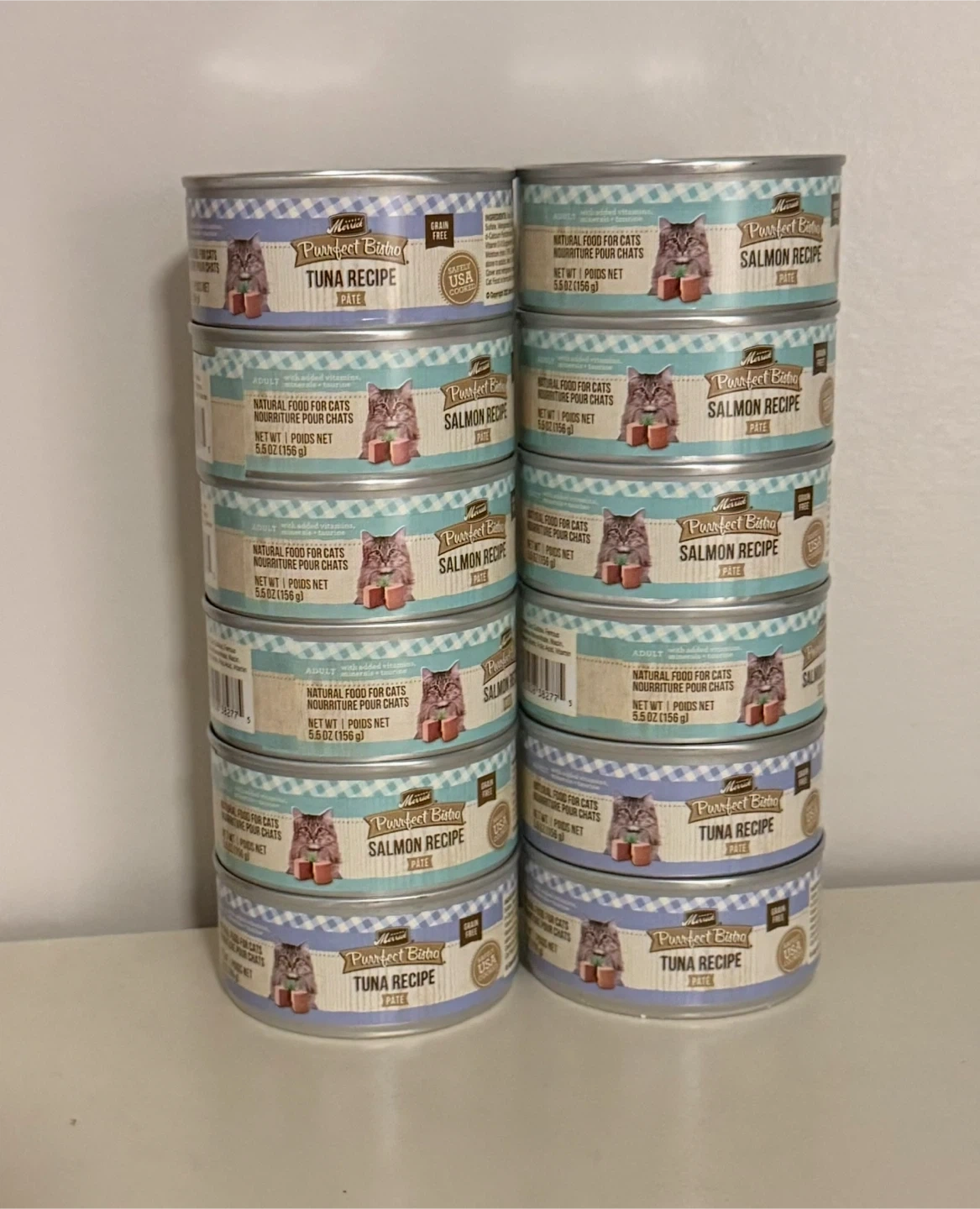 $40 for all, Selling a mix of Purrfect Bistro cat food cans! There are both Tuna Recipe and Salmon Recipe pate varieties. They are natural food for cats in 5.5oz (156g) cans.
