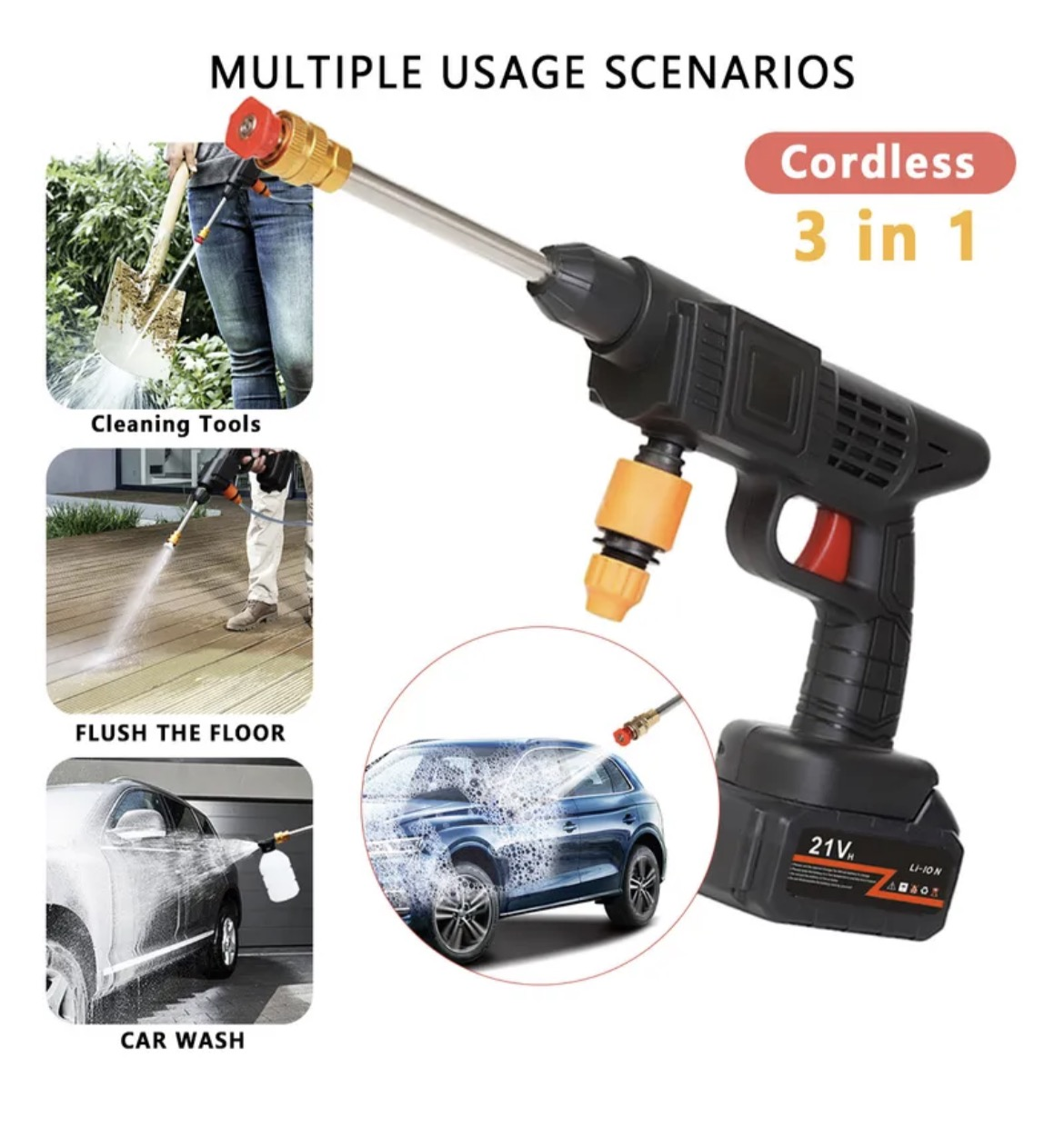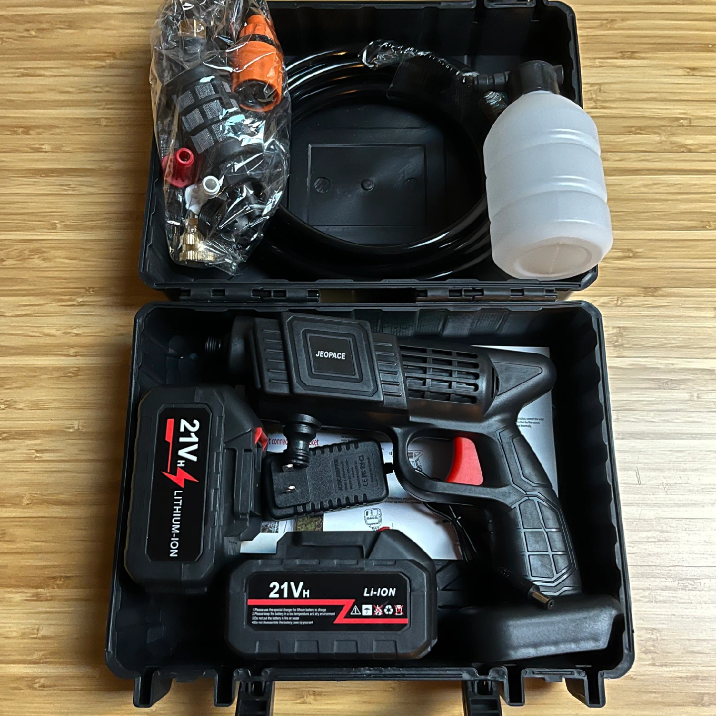 Brand New Powerful Cordless Pressure Washer. This cordless pressure washer allows you to clean quickly and efficiently in a short time. The battery powered pressure washer is equipped with long-lasting battery to ensure that it can work for up to 100 minutes after full charge. It comes with 2 high power lithium batteries so you can use them for a long time without recharging. You don't even need a continuous water source, just a bucket of water will do. Perfect for people that live in apartments but want to wash their car without a hose. Everything you see in the pictures is what you get. Comes with everything in a convenient storage / transport case. For pick up in Palisades Park, NJ.
