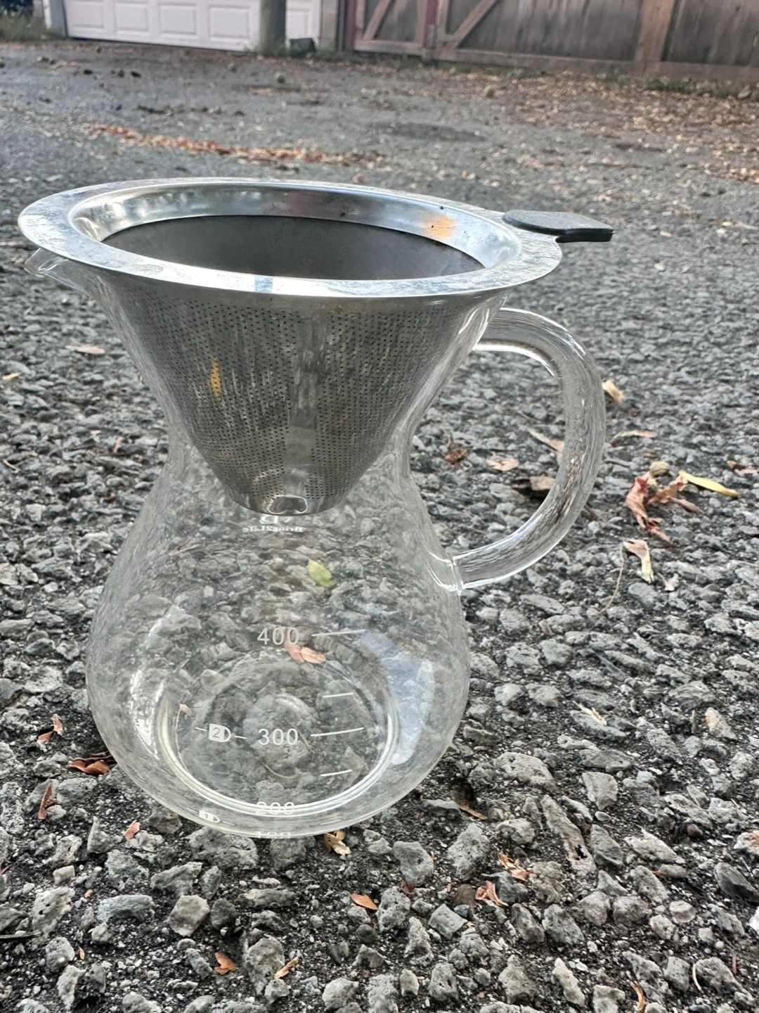 Selling a pour over coffee maker. It appears to be in good condition and ready to make some delicious coffee! The glass carafe has volume markings.