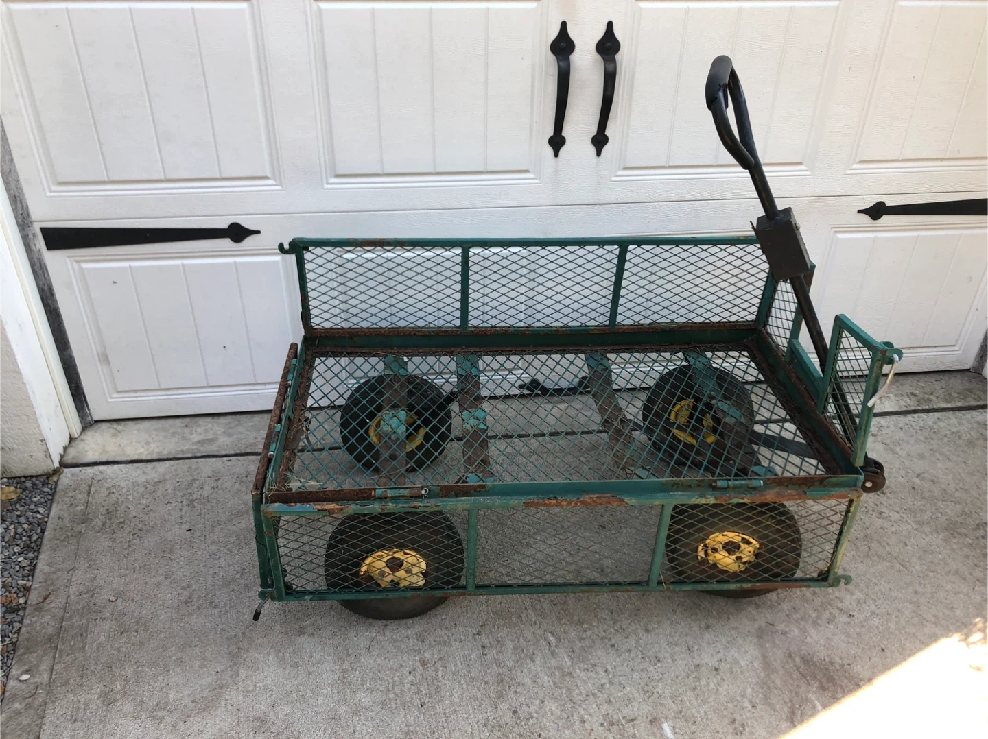 Selling a used green metal mesh utility wagon. It has some signs of wear and rust, but it's still functional for hauling items around the yard or garden