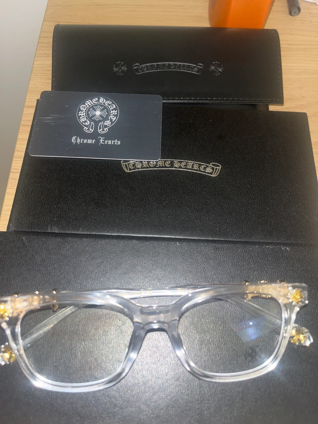 Selling a pair of Chrome Hearts eyeglasses with a clear frame! They come with the original box and packaging. These glasses feature the signature Chrome Hearts design elements. Feel free to message me with any questions!