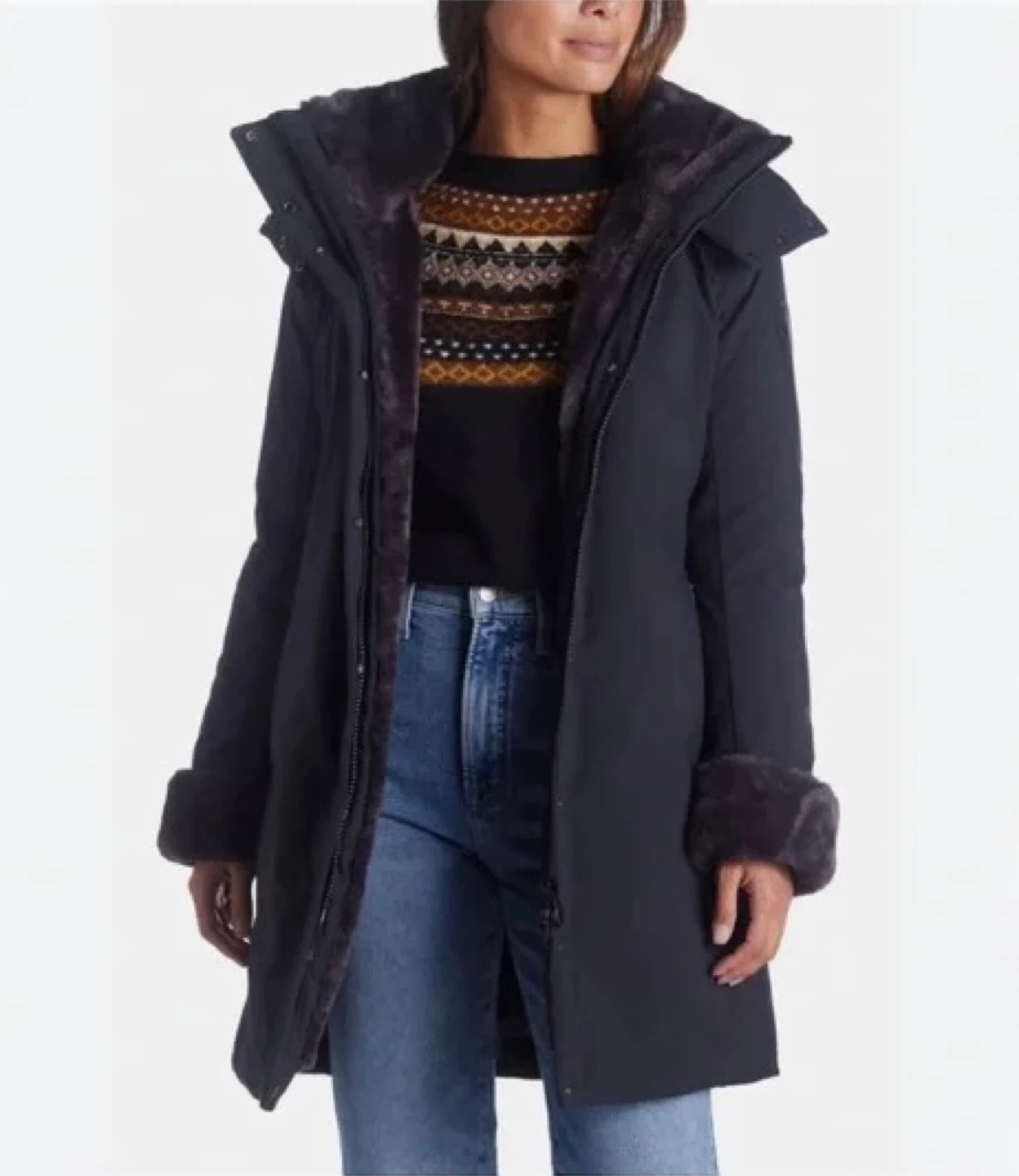 • Design: Parka with a detachable hood and cuffs, both with faux fur trim.