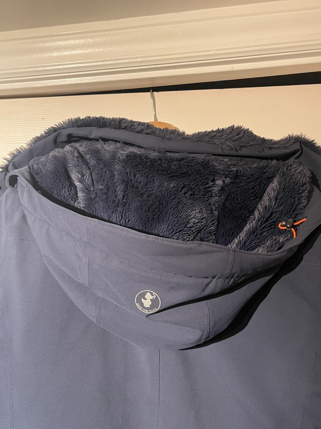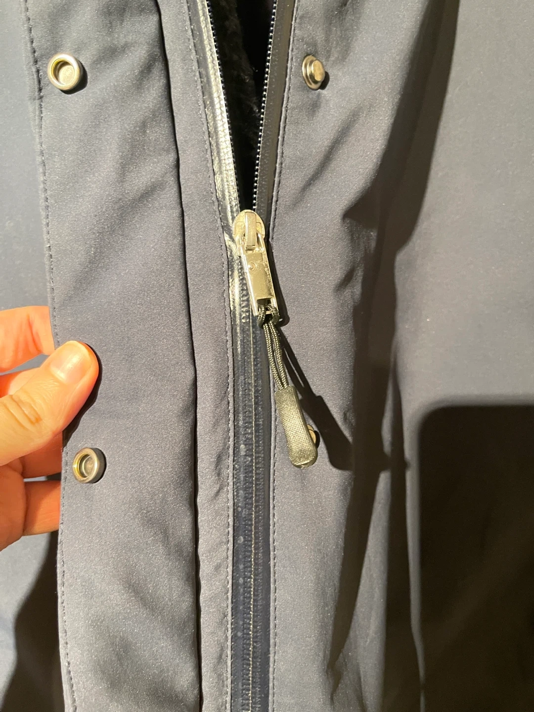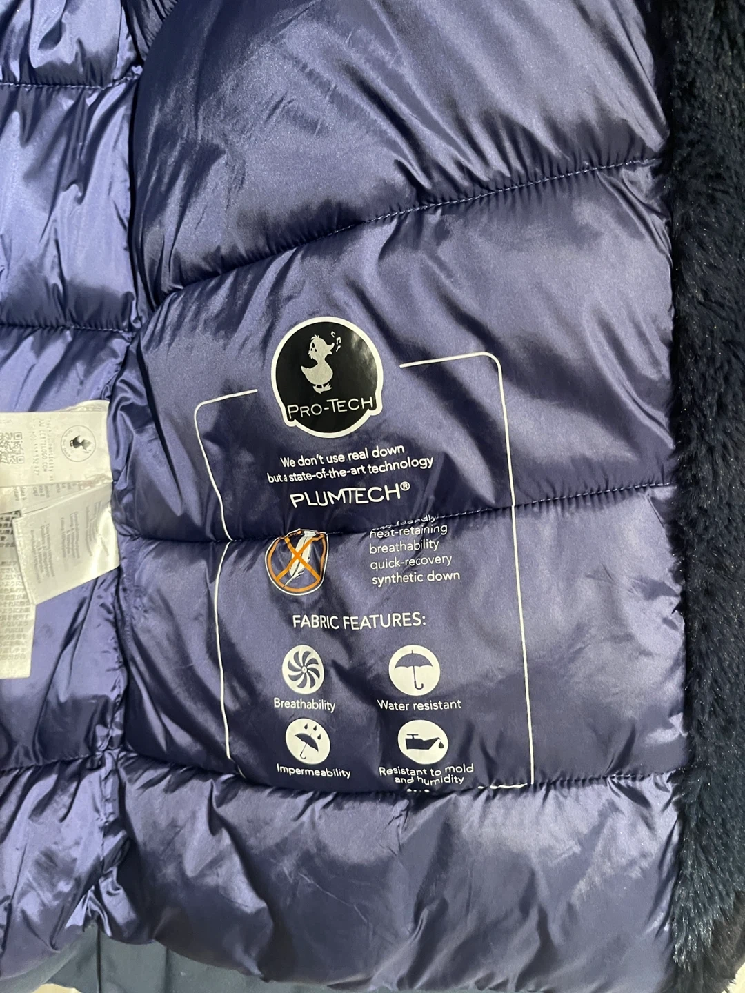 Pre-owned stylish vegan parka in navy blue, in good condition. Some wear on the faux fur trim and upper zipper tab (will include replacements) but zipper still functions well and no other damages. Size 5, EU XXL (fits sizes US L and XL). Ideal for weather up to -30C. Machine washable.