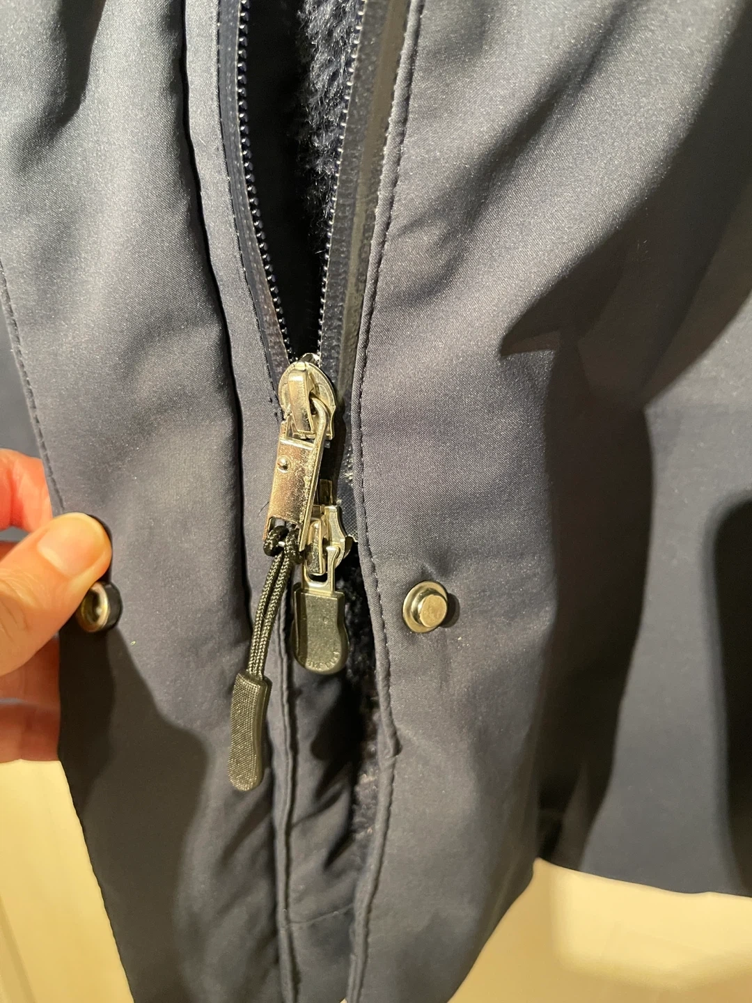 • Features: The coat has a full-length zipper with a snap button placket, and two zippered side pockets.