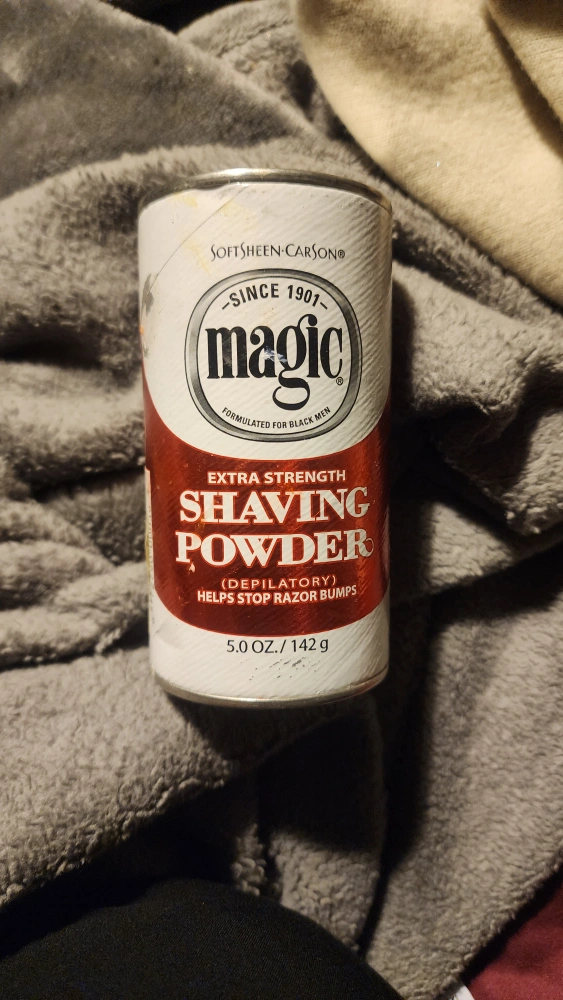 Selling a can of Magic Shaving Powder, extra strength formula. It's designed to help stop razor bumps and is formulated for Black men. The can contains 5.0 oz / 142 g of product.