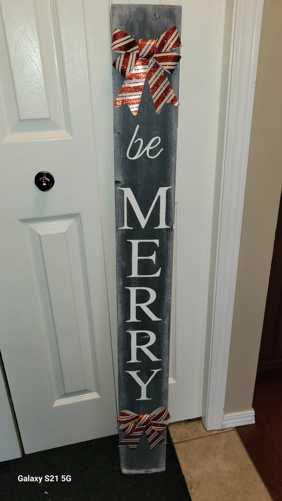 I'm selling a handmade wooden sign that says 'Be Merry'. It's decorated with festive red and white striped bows at the top and bottom. This sign would be perfect for adding a touch of holiday cheer to your home!