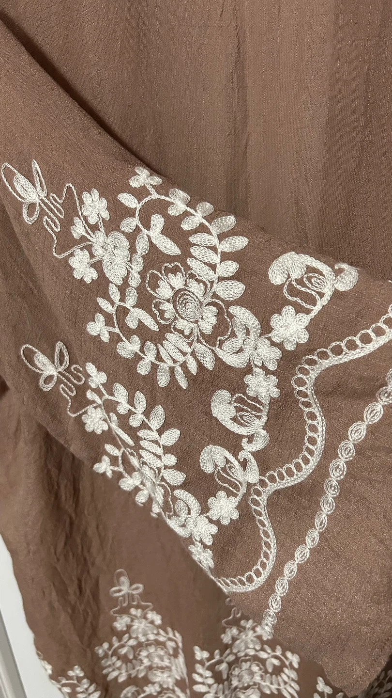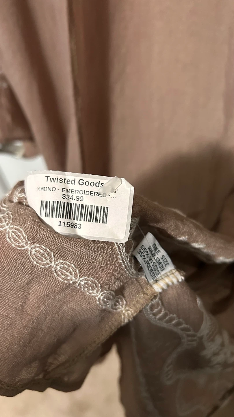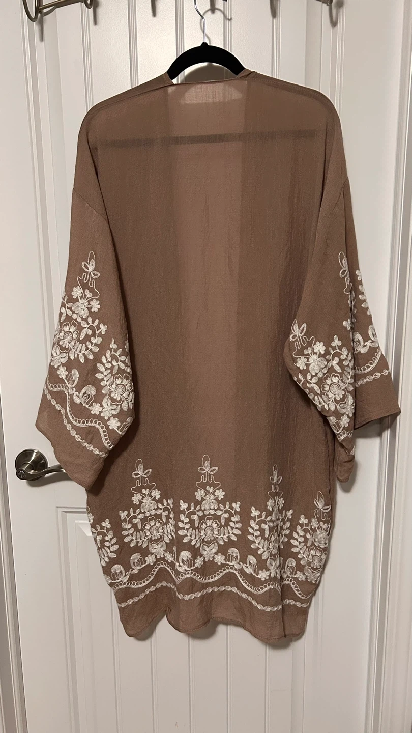 This is a lovely brown kimono with white embroidery. It's a one-size-fits-all and made of 65% viscose and 35% polyester. It's in great condition and ready for a new home!