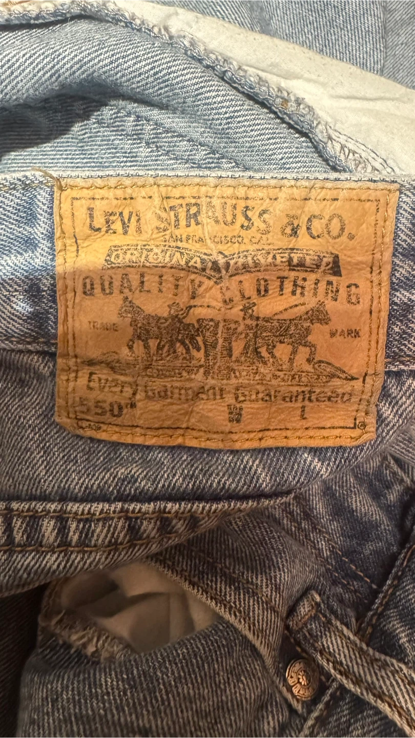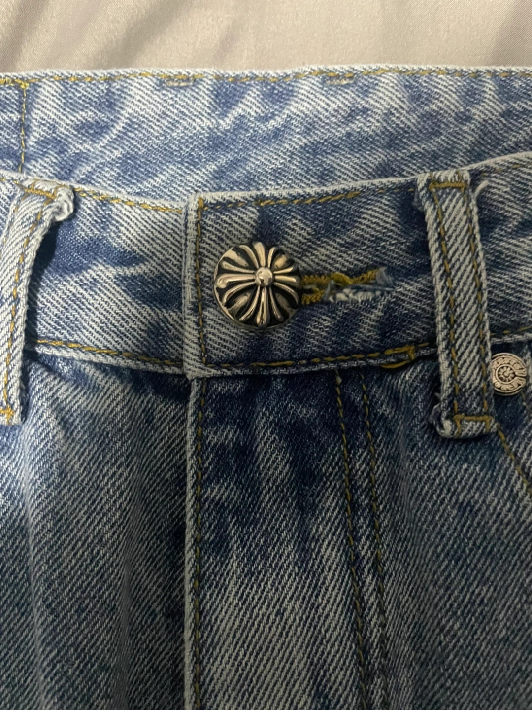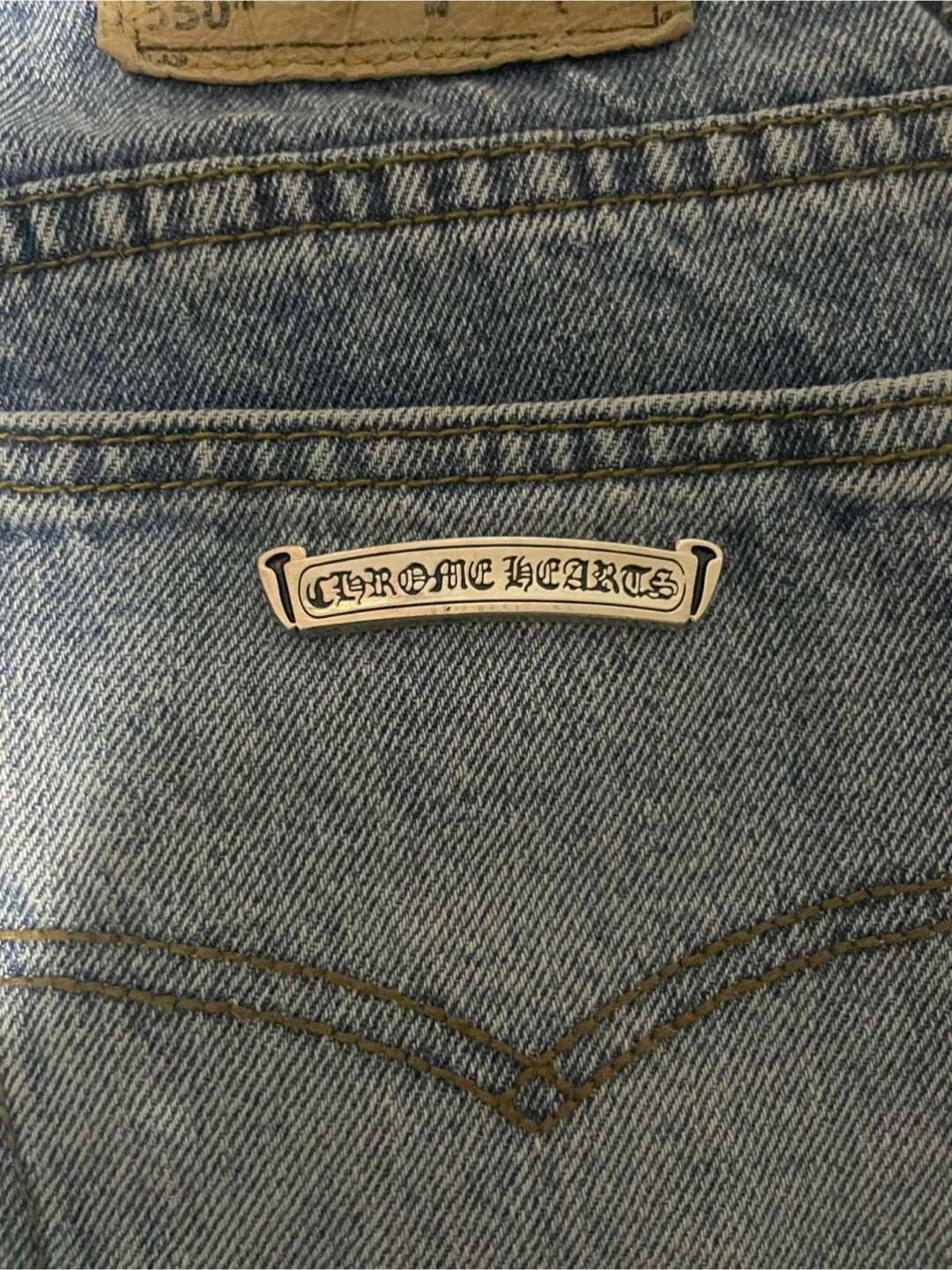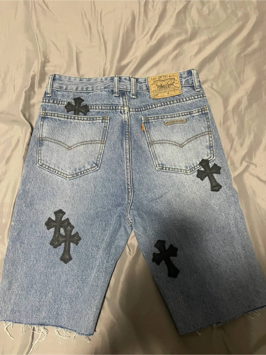 Chrome Hearts denim shorts made from Levi's 550 jeans. These have a light wash and are adorned with cross patches. A unique and stylish addition to any wardrobe! Men size 32-34