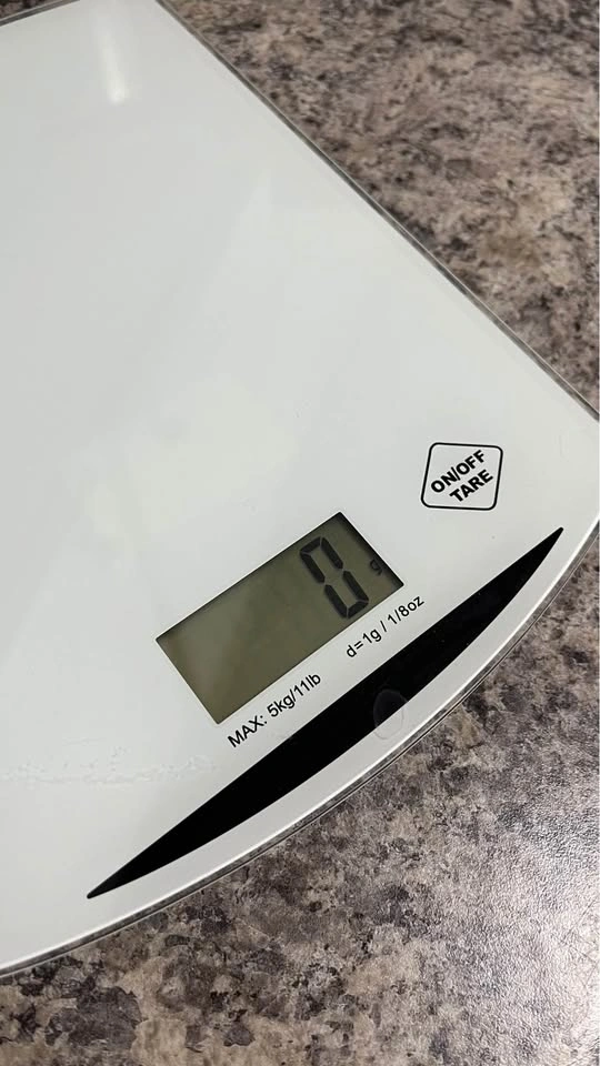 Digital tempered glass kitchen scale in white.
