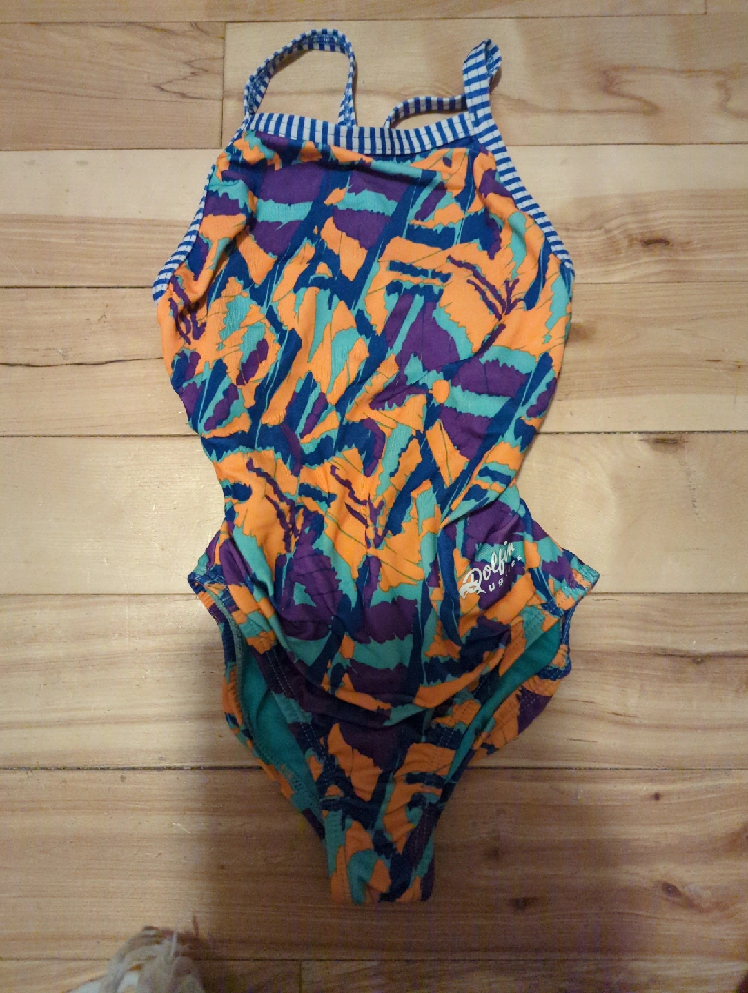 Dolfin Uglies Swimsuit. It features a fun, colourful pattern with shades of orange, teal, and purple.