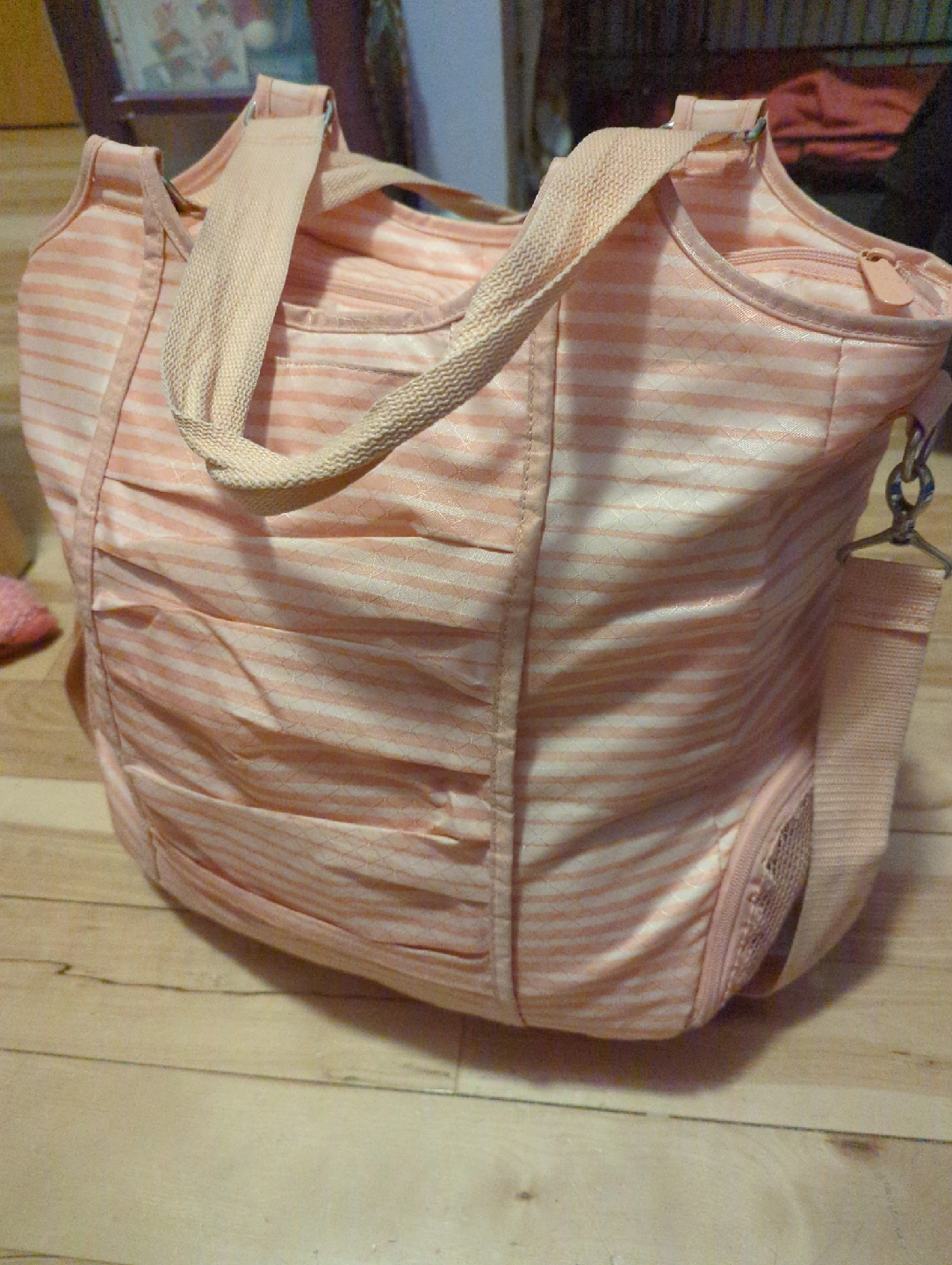 This is a cute pink tote bag with a striped design. It features a mesh pocket on the side and a zippered closure.