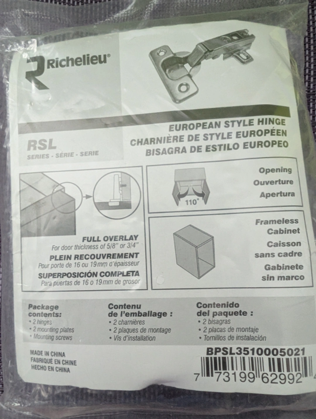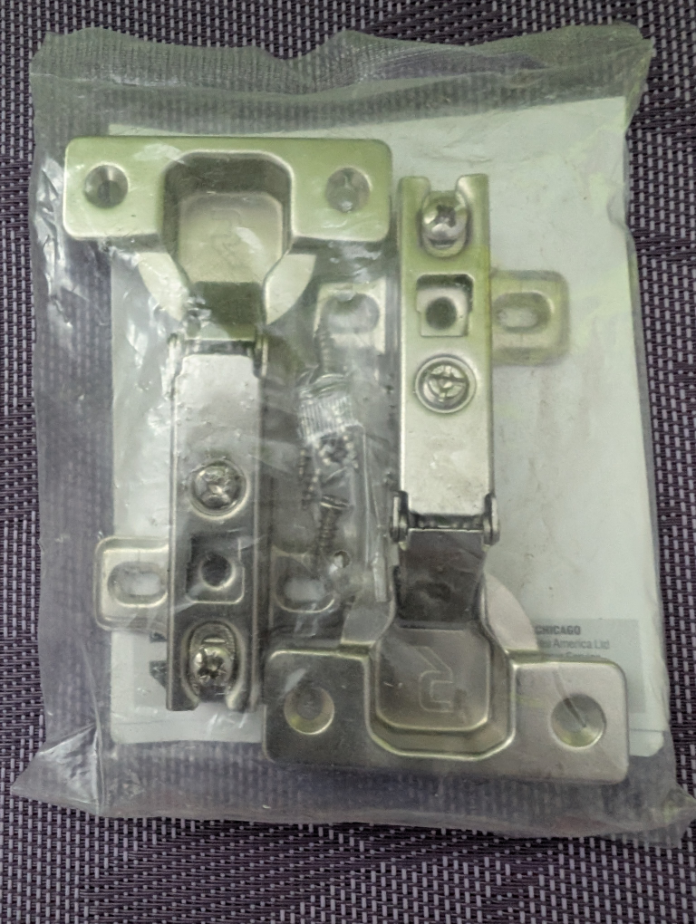 Selling a new Richelieu European style hinge. It's a full overlay hinge for door thickness of 5/8" or 3/4". The package includes 2 hinges, 2 mounting plates, and mounting screws. Perfect for frameless cabinets!